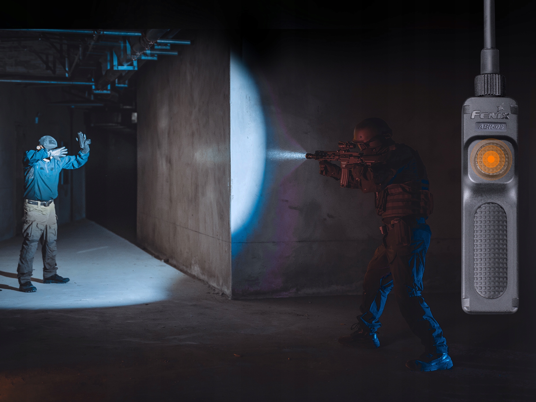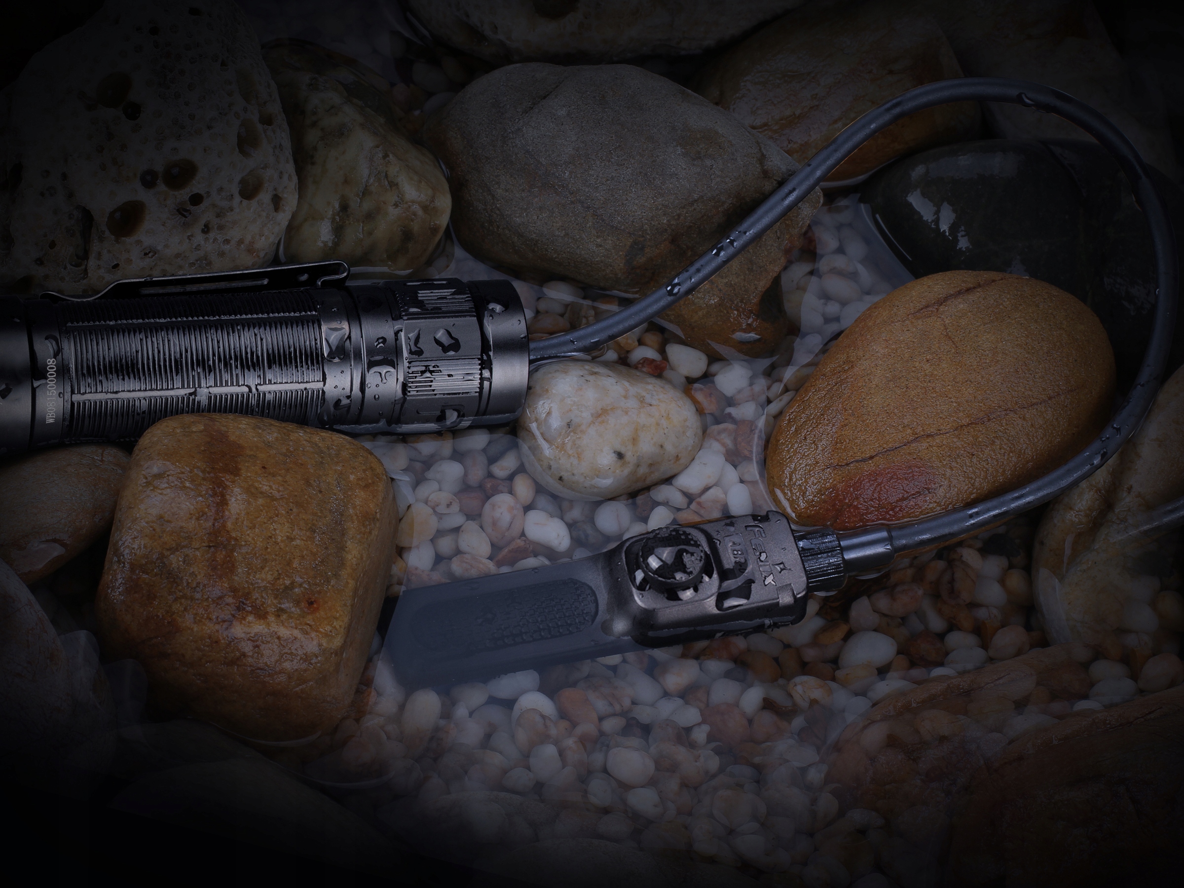 AER-05 оснащений двома кнопками, тобто безшумним реле тиску (без клацання) з високою чутливістю для активації миттєвого освітлення та зміни режимів, а також круглим тактичним перемикачем (з клацанням) для ініціювати роботу ліхтарика та безперервне освітлення.
