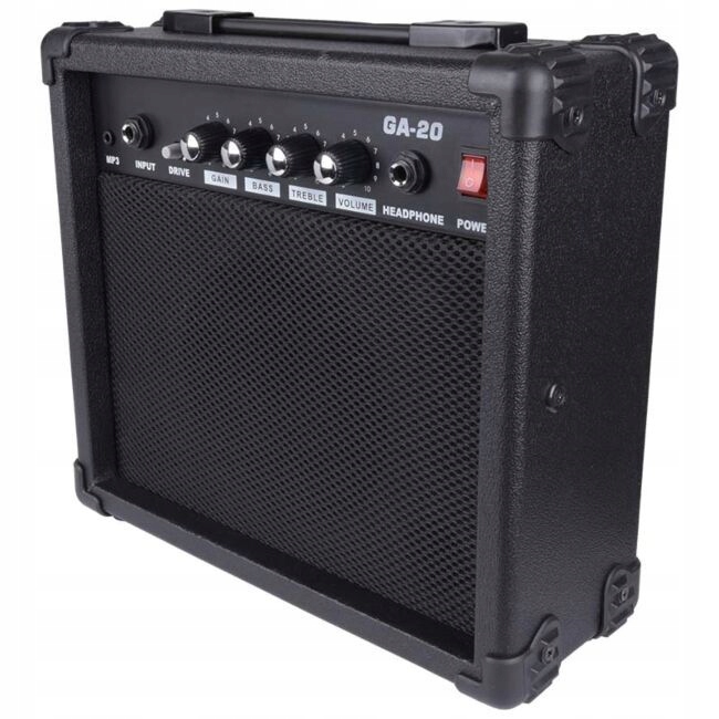 Гітарний "підсилювач" EAG SET має потужність 20 Вт і вихід на навушники, тому ідеально підходить для гри вдома, але не тільки. 5-дюймовий динамік укладено в класичний чорний корпус. Над ним розташована панель гітарного підсилювача з інструментальним входом 6,3 мм моноджек для підключення інструменту до комбо, а також вхід міні-джек MP3/AUX для підключення зовнішнього плеєра. Завдяки цій опції ми можемо розучувати будь-які пісні, граючи на гітарі під фонову музику. Панель підсилювача містить 4 потенціометри, що контролюють гучність, посилення і корекцію кольору високих і низьких тонів. Крім того, натискання перемикача Drive спотворює сигнал гітари, що дає змогу отримати специфічний, «брудніший» звук, характерний для таких музичних жанрів, як блюз, рок або метал.