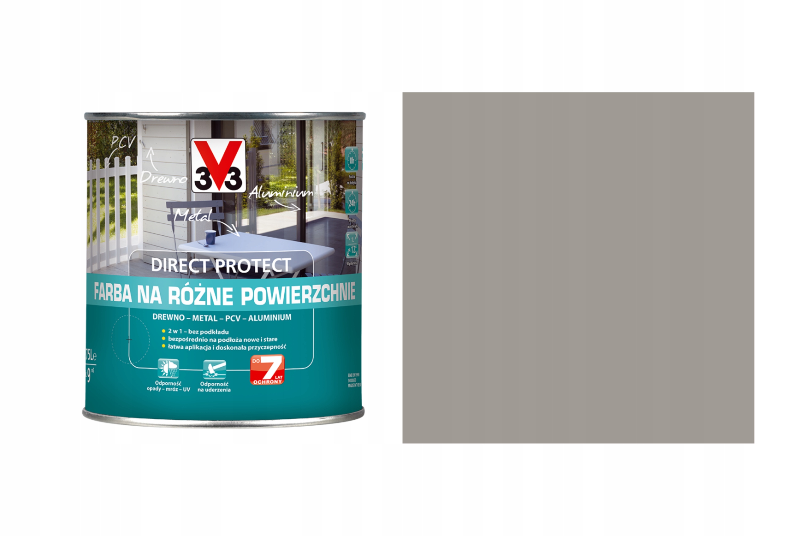 Прямий захист V33 фарбів не слід використовувати на підлозі, цегляній поверхні, змащеній або восковій деревині та для елементів, виготовлених з гнучких пластиків, таких як пластикові садові меблі, горщики тощо на субстратах PVC, що відображаються на сильних солярних радіації.
