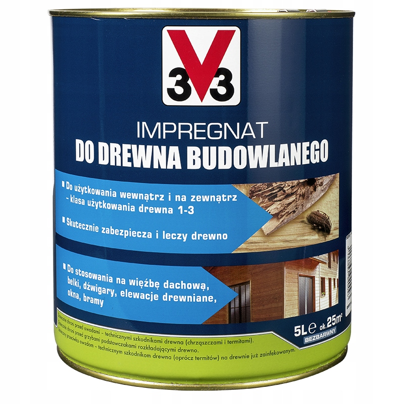Просочення деревини для конструкцій V33 призначене для деревини 1, 2 і 3 класів використання, тобто всередині і зовні приміщень, для дерев’яних елементів, які не мають прямого контактують із ґрунтом або поверхневими водами, але піддаються частому або періодичному зволоженню. Ідеально підходить для використання на всіх типах будівельної деревини, наприклад, фермах, балках, балках, дерев’яних фасадах, вікнах, воротах.