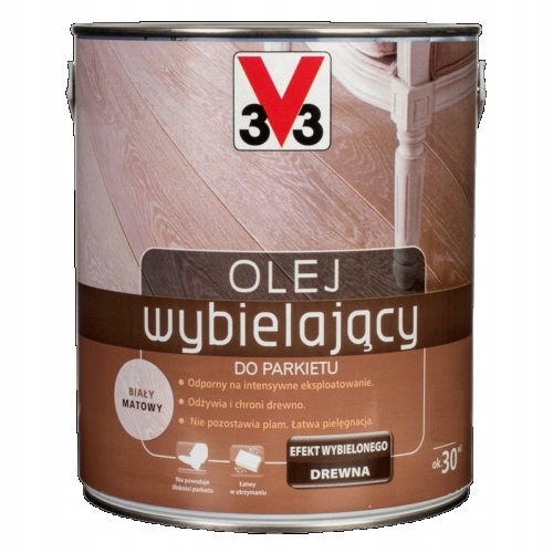 Використання олії для відбілювання паркету V33 має перевагу в тому, що дозволяє локально відновити паркет (у разі аварії або тимчасово підвищеної інтенсивності руху тощо). Паркет в цьому місці потрібно злегка відшліфувати, очистити від пилу і покрити шаром масла, а через 5-10 хвилин видалити надлишки. Залиште висихати на 24-48 годин. Щоб повністю оновити паркет, протріть поверхню наждачним папером, видаліть пил, а потім нанесіть два шари масла - такі ж, як і при першому нанесенні. Ідеальні умови нанесення від 12 до 25°C
