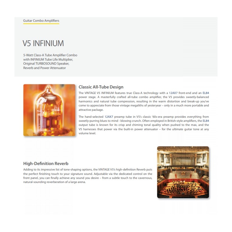 Найменший представник серії Vintage. Ідеально підходить для студії та занять вдома. Повністю ламповий комбо, зібраний вручну з використанням 2 ламп - 12AX7 (попередній підсилювач) і EL84 (підсилювач потужності). Класичне блюз-рок звучання забезпечується схемою класу А та динаміком від британської компанії Turbosound. Збагачений запатентованою технологією INFINIUM Tube Life Multiplier, яка забезпечить повний контроль звуку, відстежуватиме роботу ламп і подовжує термін їх служби до 20 разів!