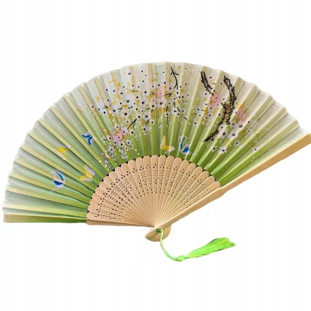 вентилятор з бамбуковим скелетом з різьбленими прикрасами та тканиною з барвистим принтом. Вентилятор не тільки надасть вам полегшення в спекотні літні дні, але також є чудовим доповненням до багатьох випадків. Наприклад, для карнавалу, тематичних подій, фотобудки або для розташування. Його також можна використовувати як декоративний елемент. Відкритий діапазон має розміри 21х38 див.