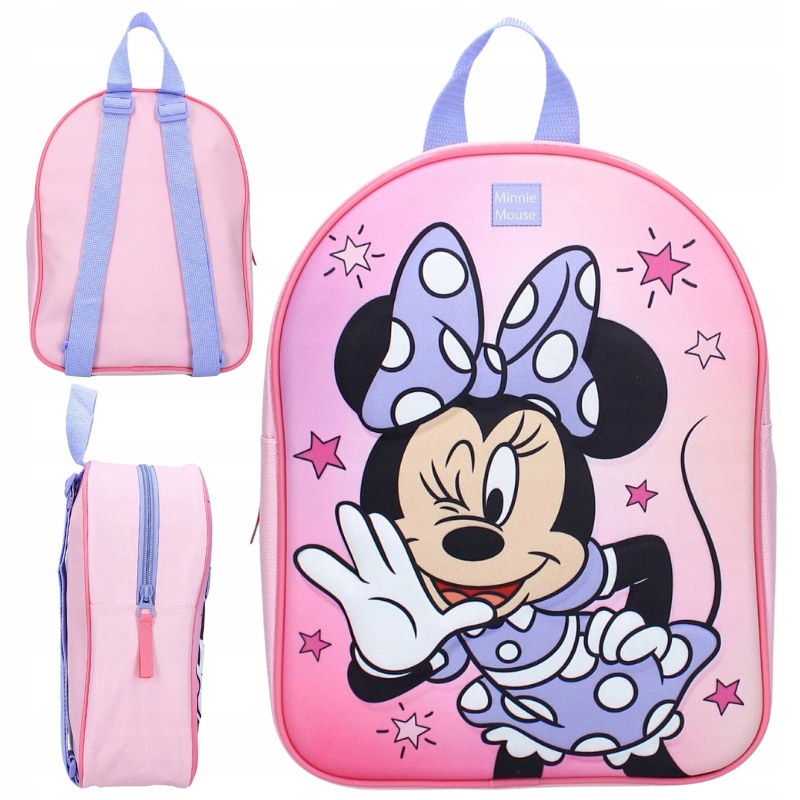 Він виконаний у рожевому кольорі з фіолетовими деталями, а на передній частині рюкзака є опуклий 3D-принт із мотивом улюблена діснеївська мишка - Мінні.