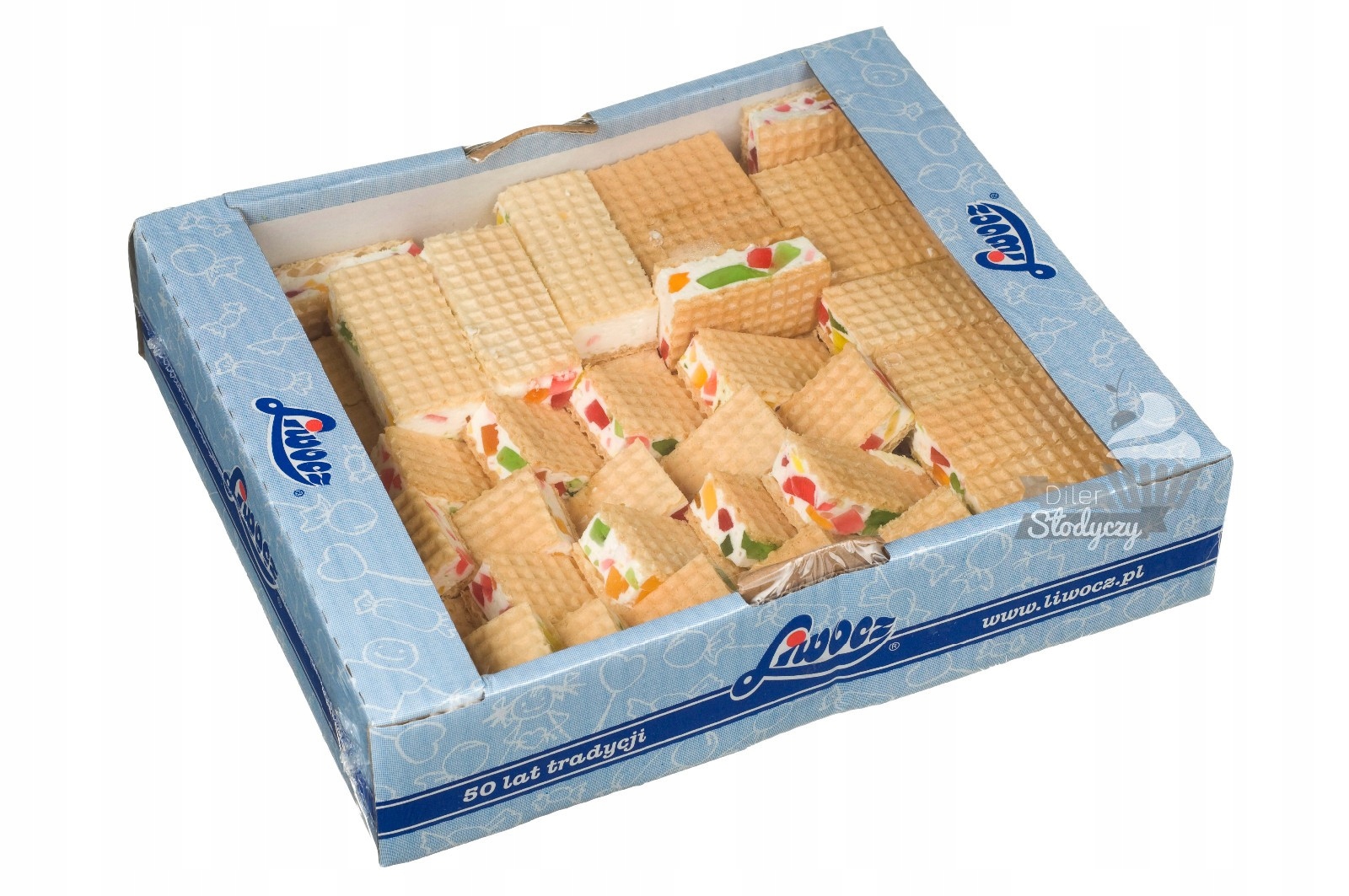 .Вафлі з кремовою пінкою та шматочками желе від польської компанії Liwocz. Спокуслива пропозиція для любителів цього виду печива. В одній упаковці багато смаколиків. Продається упаковками по 1,5 кг вафель.