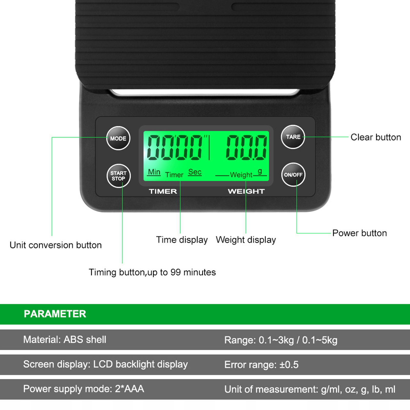 ⭐ 4 Одиниці перетворення G, OZ, LB, ML або G/ML; 4 Функціональні клавіші Увімкнення/вимкнення, Тарінг, одиниці, старт/зупинка.