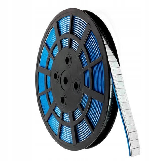 склеєна, сталева вага, для алюмінієвих ободів, сріблястого оцинкованого. Пакет містить рулет з 1000 штук ваги з вагою 5 грам. Ваги з елегантною, округлою формою ідеально пристосовуються до ободу, гарантуючи точний баланс алюмінієвих ободів. Ваги також мають широку синю стрічку, яка захищає клейку стрічку.