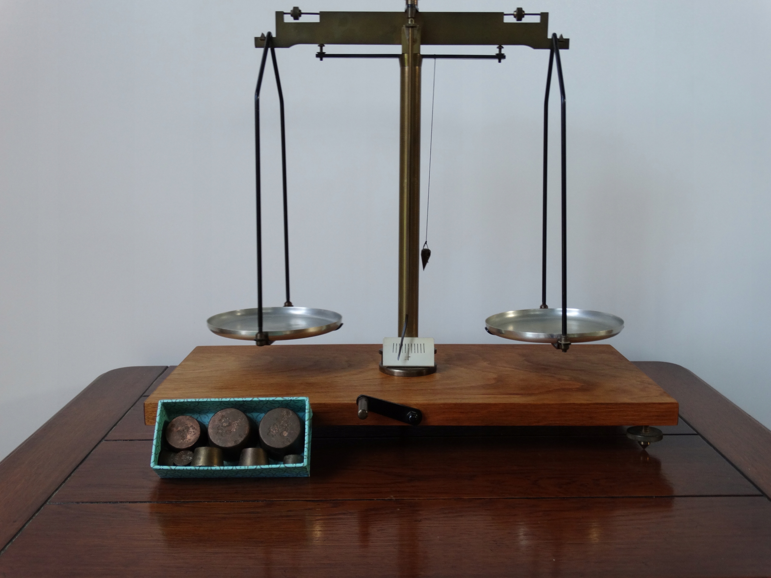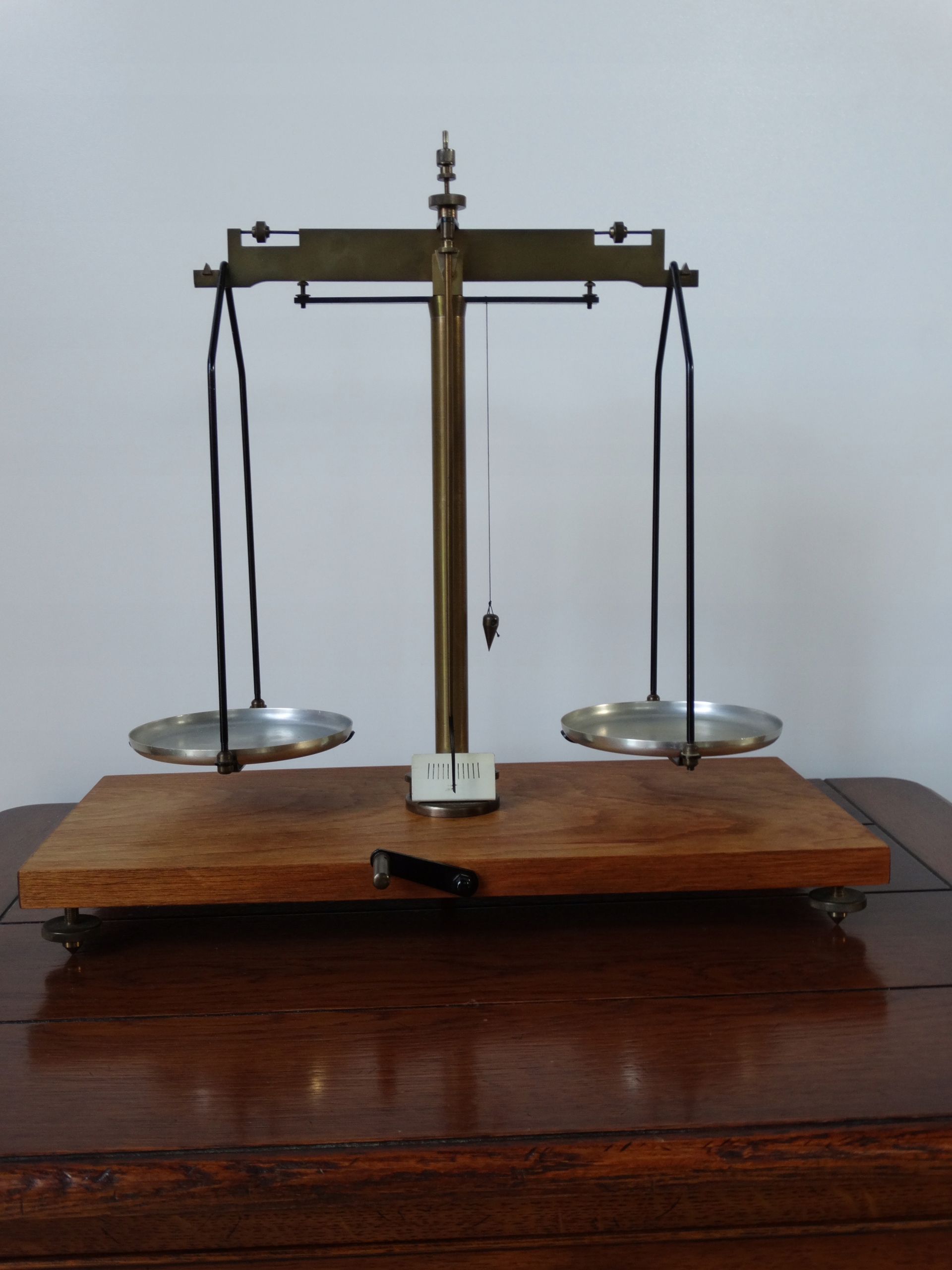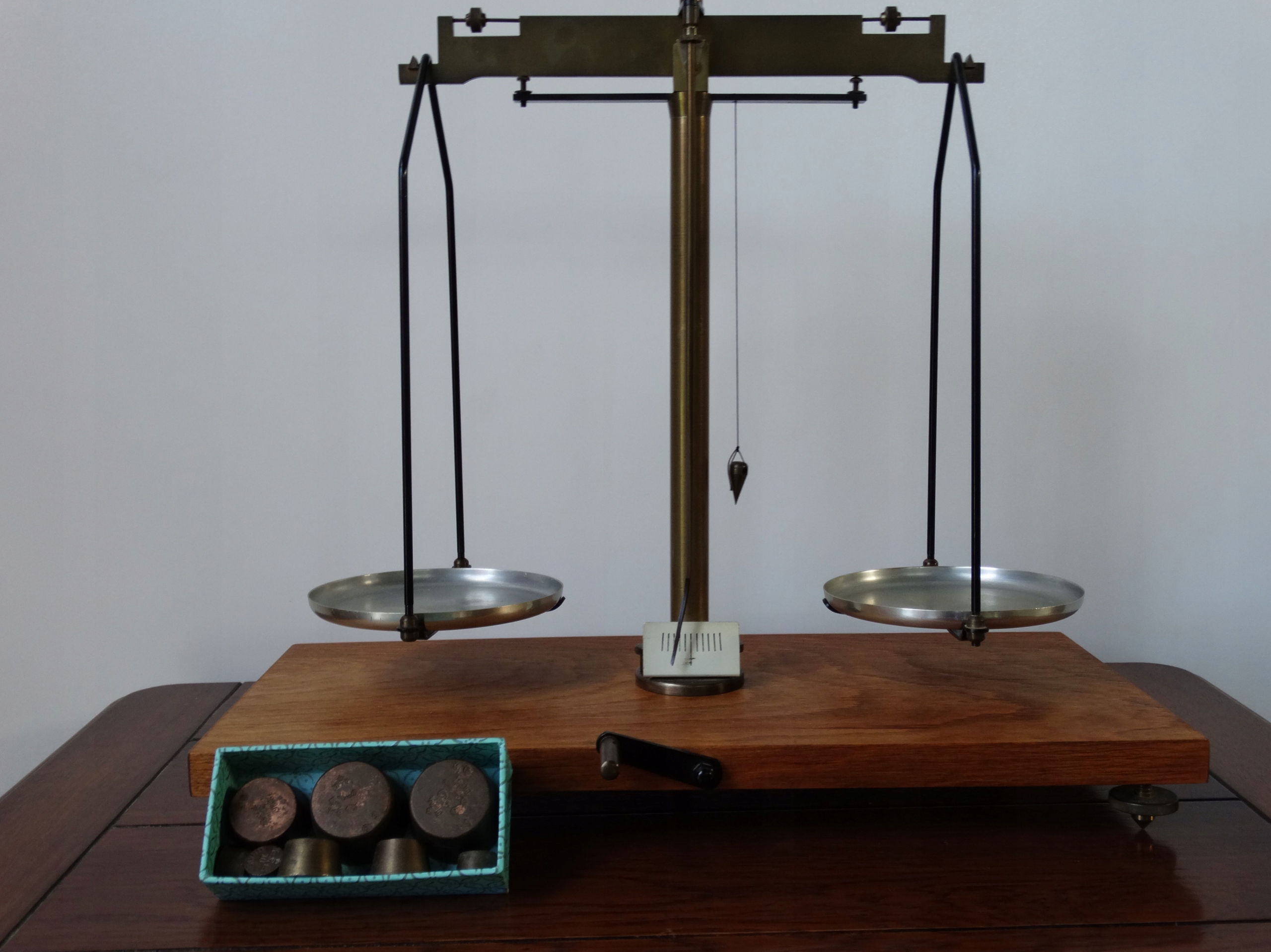 Ваги латунні на дерев'яній стільниці, алюмінієві каструлі