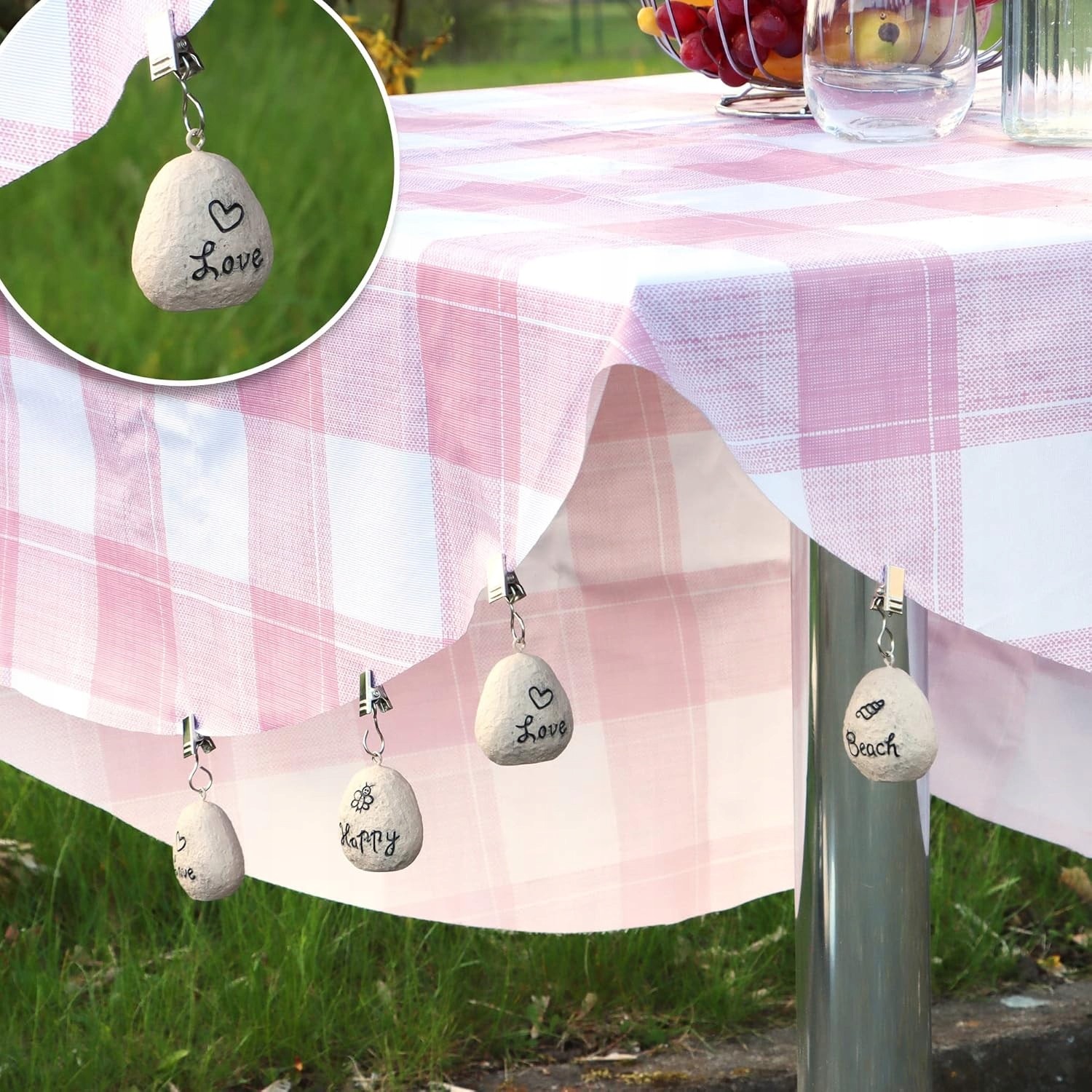Завдяки суцільним затискачам ваги миттєво встановлені на край скатертини - без необхідності інструментів. Вони підходять до більшості стандартних тканин.