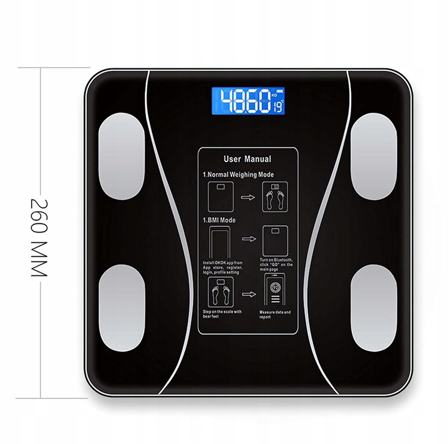 Ці розумні цифрові ваги для ванної кімнати - це елегантний і високоточний прилад для моніторингу здоров'я та фігури. Він підключається бездротовим способом через Bluetooth до мобільної програми, дозволяючи вам відстежувати свій прогрес і аналізувати склад свого тіла. Він пропонує вимірювання 13 еталонних показників тіла, включаючи ІМТ, масу жиру в організмі, воду в організмі, м’язову масу, кісткову масу, вісцеральний жир і білок. Ваги мають пам'ять на 10 користувачів, що робить їх ідеальними для всієї родини. Виготовлений із загартованого скла (280x280 мм) і ABS пластику, він має мінімалістичний, розкішний дизайн. Він живиться від батарейок (2x AAA), а максимальне навантаження становить 180 кг з точністю до 0,1 кг.