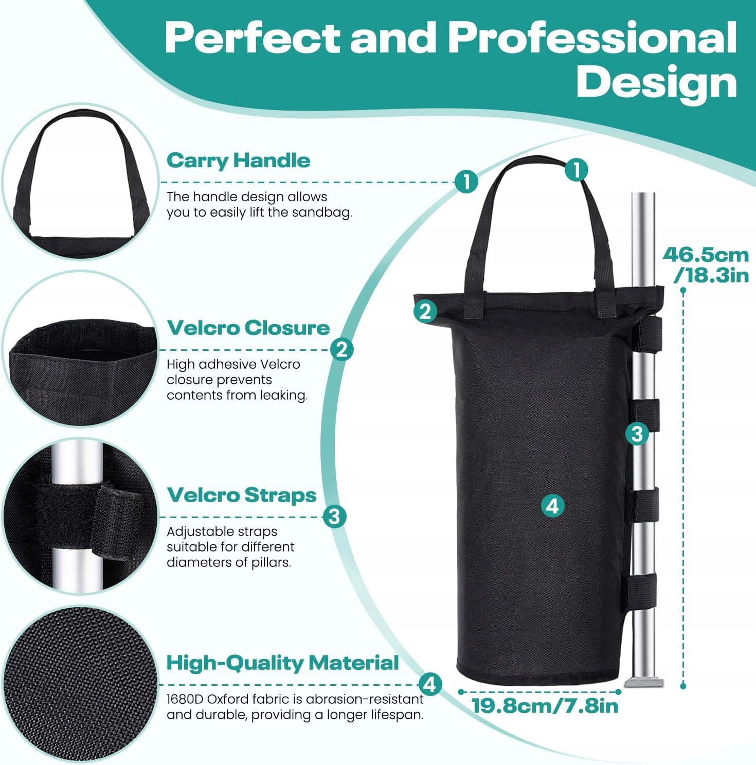 - 4 -частинних ваг, встановлених для павільйону: підходять для всіх різних типів наметів, павільйонів, парасольок, батутів тощо, що підходять від 15 мм до 80 мм. Ці пакети навантаження виготовлені з міцної тканини Oxford 1680D (поліестер) з покриттям з ПВХ, яке має високу щільність швів, стійкий до сльозотечі та зносу, тривала роками. місце.