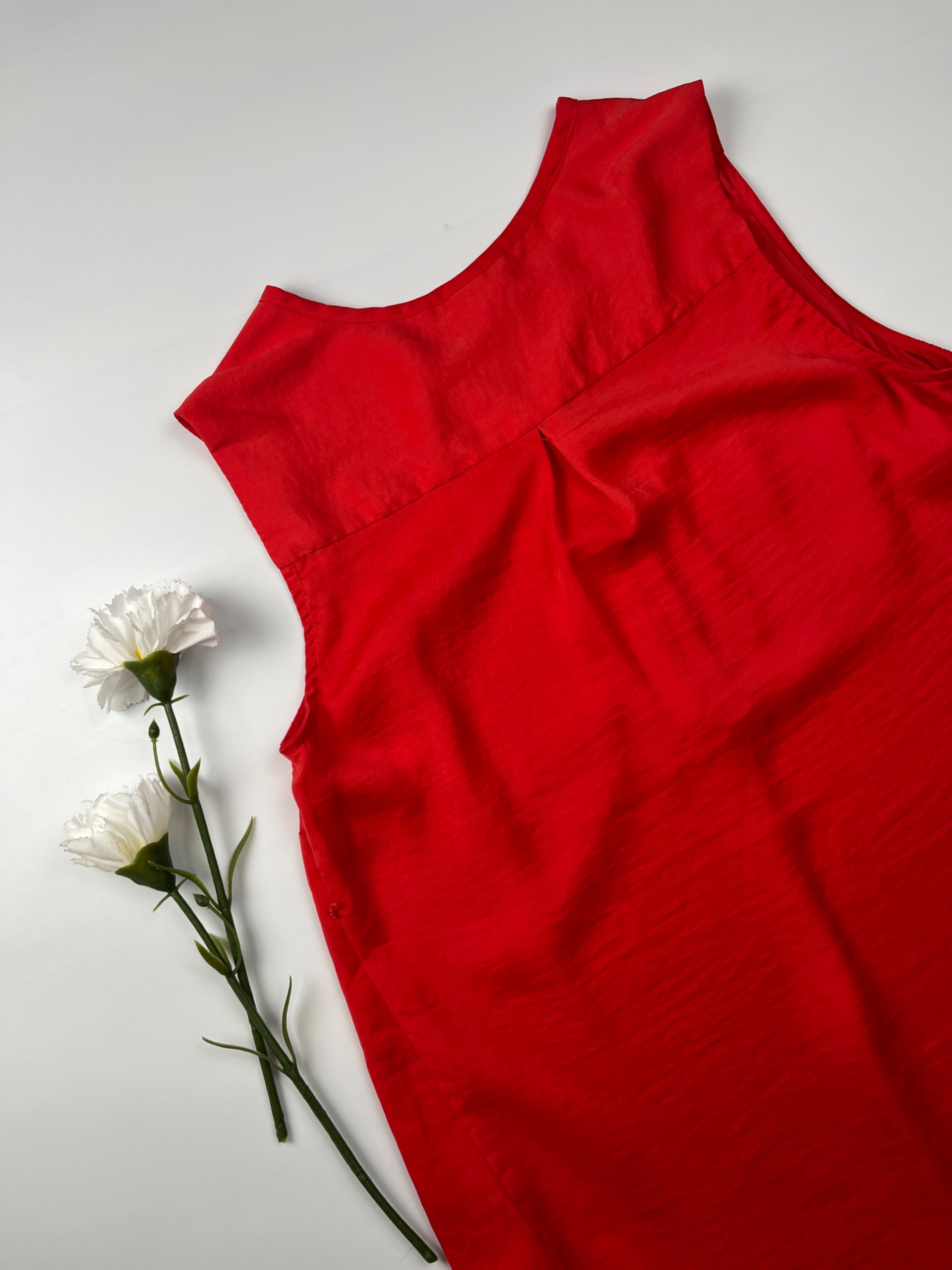 - H&M жіноча блузка. Це в інтенсивному червоному кольорі. Розріз блузки простий, вона без рукавів. Має обрізане кругле декольте. Пришив з приємного дотику та легкого матеріалу. На висоті декольте, він має дві відкриті кишені. Блуза має ремінні петлі. Це, безумовно, буде ідеальним як основа для багатьох стилів як для менш формальних випадків, так і для вечірніх виїздів. Універсальна зовнішність та простота блузки безумовно перетворюються на колодязь майбутньої матері.