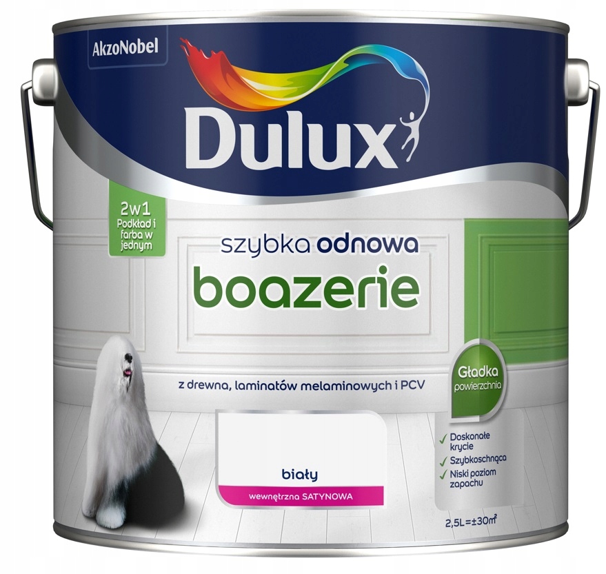 Dulux Szybka Odnowa - це сучасна лінійка універсальних фарб для фарбування різноманітних поверхонь в домашніх умовах. Ідеально підходить для швидкого ремонту та надання нового блиску вашим улюбленим речам.Dulux Quick Renewal WALLING - це водорозчинна фарба для ремонтного фарбування попередньо лакованої вагонки, стінових панелей, як дерев’яних, так і покритих меламіном. ламінати та ПВХ. Фарба призначена для внутрішнього використання. Його легко використовувати, тому що вам не потрібен праймер. Отримані покриття характеризуються гладкою поверхнею та чудовою декоративністю.