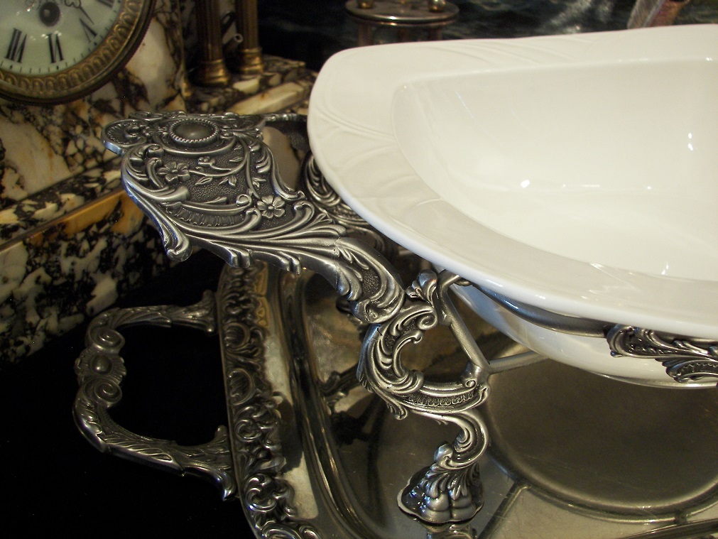Я запрошую вас подати ставку на вражаючу, глибоку миску, тарілку чи, можливо, тарілку, встановлену на надзвичайно багато прикрашеній основі в стилі бароко, додатково прикрашеній, як це були, картуші в оточенні квітів.Виріб надзвичайно багато декорований.Весь виготовлено зі сплаву цинку та покрито оловом.Фарфор важкий, товстий, жароміцний, в ньому можна подавати як холодні, так і гарячі страви , дуже легко підтримувати в чистоті.