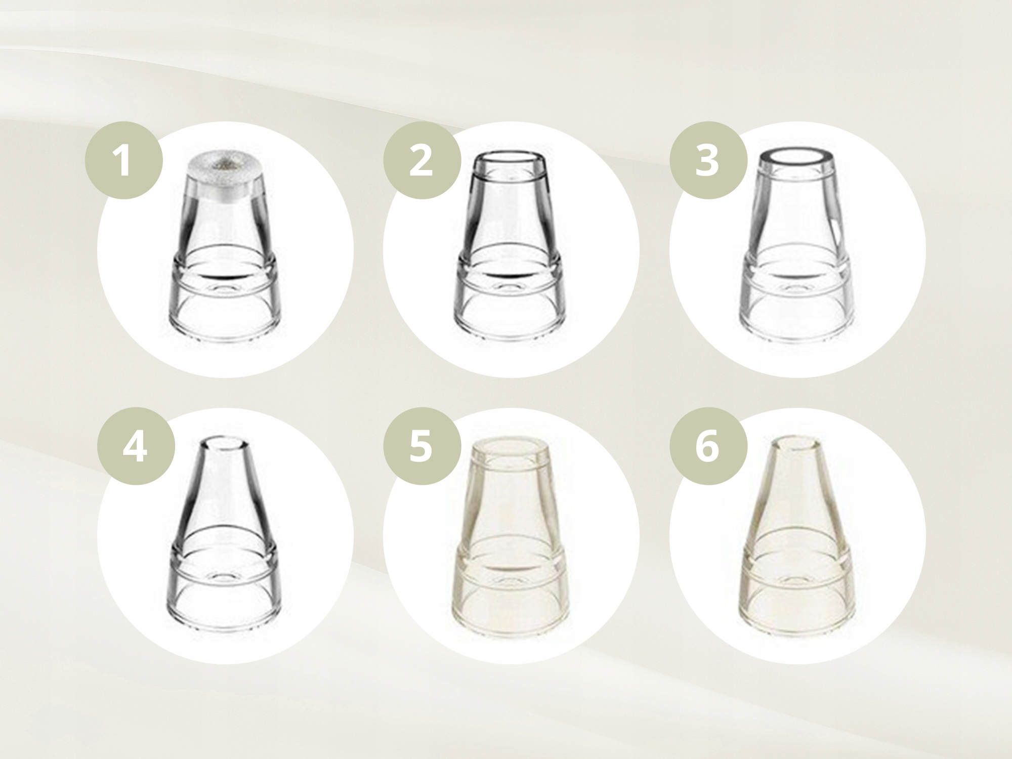 - ✅ ОЧИЩЕННЯ ПОР Направте круглий отвір на місце чорних крапок або прищів, щоб видалити їх. Якщо шкіра пошкоджена або з'явився набряк, не користуйтеся цією порадою. Якщо чорні крапки застрягли глибоко в шкірі, рекомендується використовувати великий наконечник.