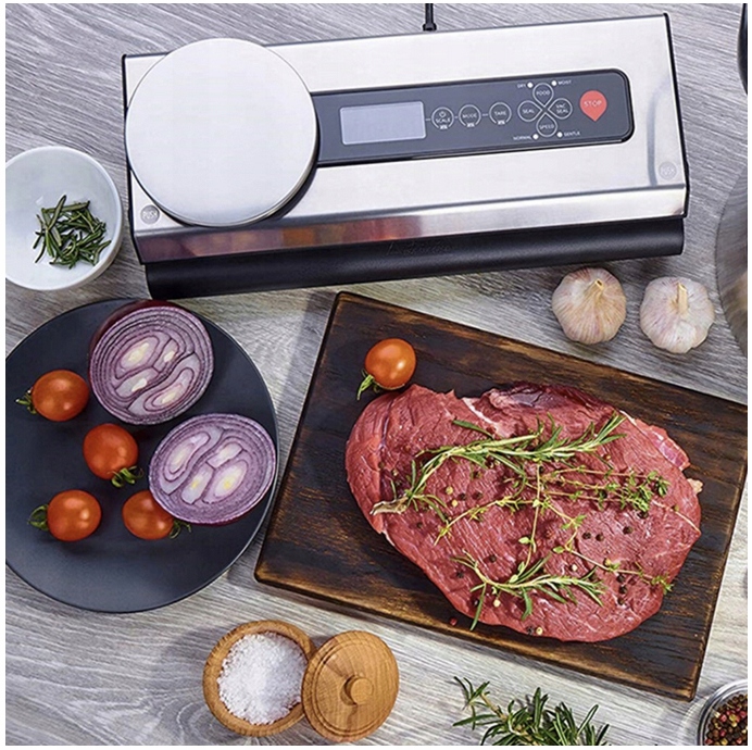 Це надзвичайний, інтуїтивно зрозумілий пристрій, завдяки якому овочі, фрукти, м'ясо, риба, нарізка та молочні продукти залишатимуться свіжими протягом тривалого часу . Їжа, що зберігається у вакуумі, не піддається впливу бактерій або цвілі. Крім того, він збереже свій смак і запах не змішується з іншими продуктамив холодильнику. Завдяки тому, що пристрій має вбудовані ваги, ми можемо порціонувати їжу перед загортанням у спеціальну фольгу. Надзвичайно проста робота пристрою для запечатування фольги означає, що вам не потрібні спеціальні навички для його використання.