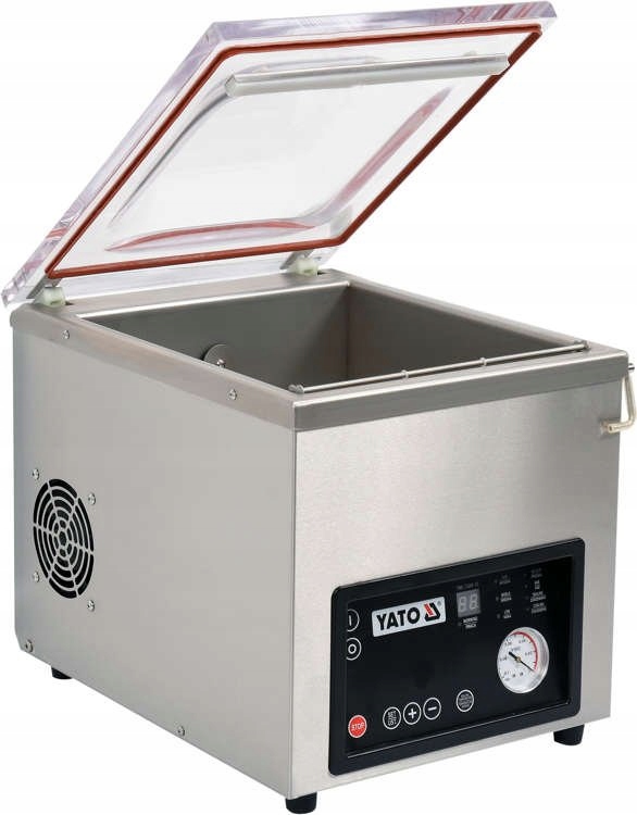 Вакуумна пакувальна машина марки YATO виготовлена з сировини найвищої якості. Вакуумна камера з розмірами 370x320x135 (185) мм виготовлена з товстої і масивної нержавіючої сталі, що гарантує дуже довгий термін служби. Заокруглені форми дозволяють легко підтримувати його в чистоті. Кришка пакувальної машини виконана з дуже міцного пластику прозорого кольору. Це дозволяє відстежувати та повністю контролювати процес пакування. Крім того, кришка має виїмку, яка додатково збільшує висоту камери з 135 мм до 185 мм, що дозволяє пакувати продукти більшого розміру.