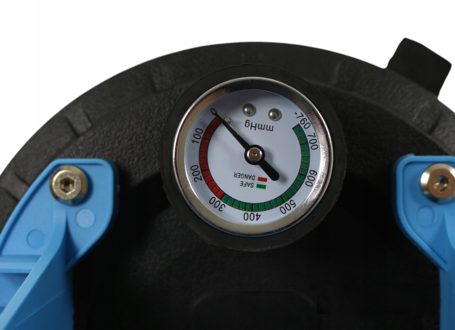 - Манометр дозволяє контролювати та регулювати тиск повітря всередині присоски, що дозволяє точно регулювати силу утримання до необхідного рівня. Це, у свою чергу, дозволяє підвищити безпеку роботи та точність при обробці скла чи інших матеріалів.