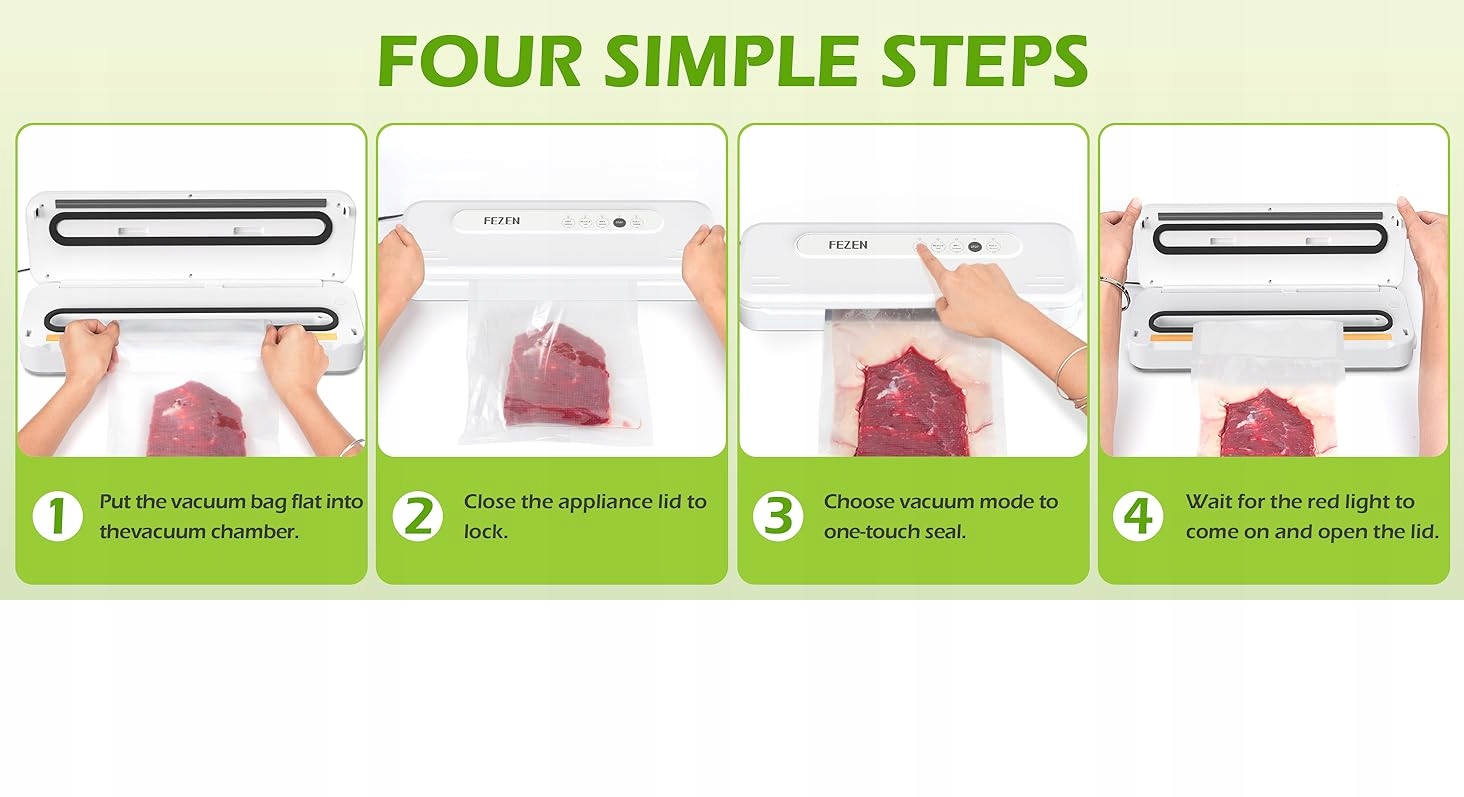 - 【ЗБЕРІГАЙТЕ ЇЖУ СВІЖОЮ ТА ЗБЕРІГАЙТЕ ГРОШІ】 Вакуумна упаковка Fezen може зафіксувати поживні речовини різних інгредієнтів і зберегти свіжими стейки, овочі, соковиту їжу тощо приготування легших страв. Це може покласти край вашим турботам про залишки їжі та харчові відходи. Просто запечатайте свою страву, і ця харчова програма збереже вашу їжу свіжою, запобіжить її підгорянню та пліснявінню в морозильній камері, зменшить псування їжі та відходи, що зробить ваше життя економнішим.