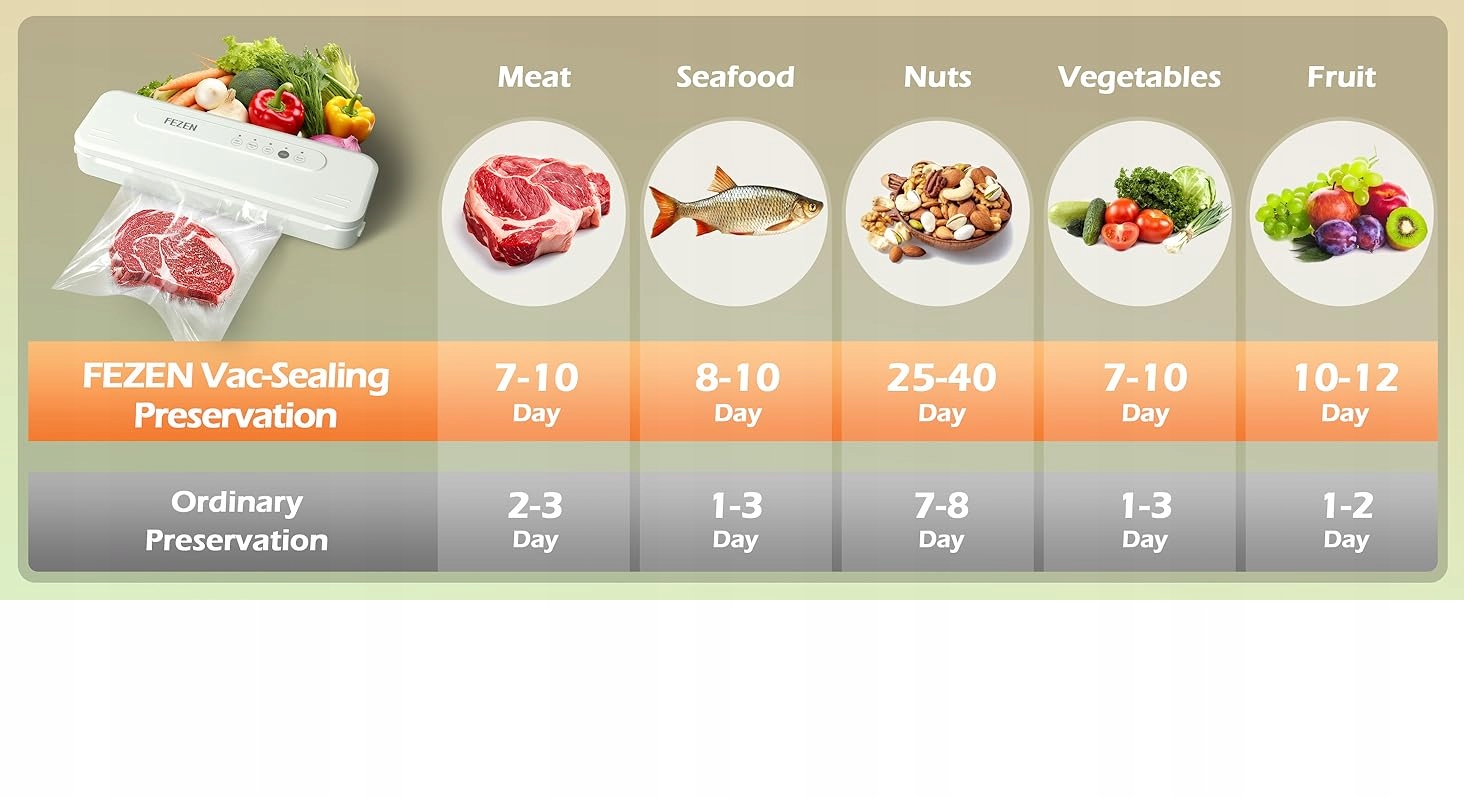 - 🍕 【ПРИГОТУЙТЕ ЇЖУ НА ТИЖДЕНЬ】 Вакуумний запаювач їжі Fezen D02 зберігає їжу у 8 разів свіжішою, ніж регулярні способи консервації. Таким чином ви можете приготувати страви заздалегідь на тиждень, не турбуючись про згоряння в морозилці чи відходи. Запечатайте страву, запечатайте свіжість. Ви можете готувати різні комбінації меню, щоб задовольнити різні потреби вашого організму в поживних речовинах. Почніть планувати свою здорову дієту за допомогою цього вакуумного запаювача їжі!