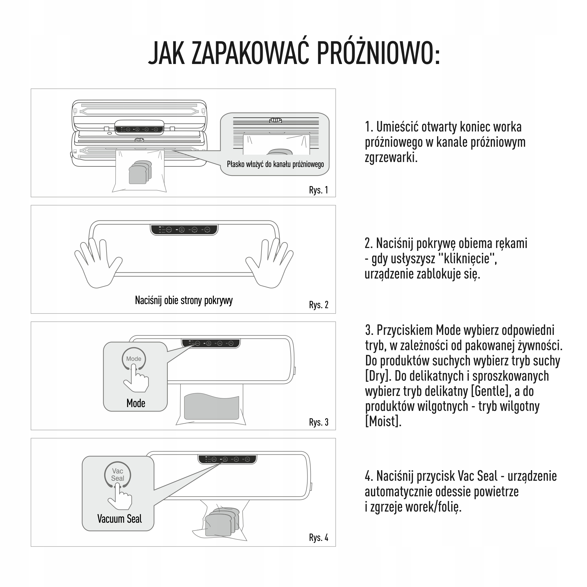 - Свіжість і смак надовго- за допомогою вакуумної упаковки їжі ви подовжите її свіжість і термін зберігання. Ущільнювач дозволить легко запакувати у вакуум також у контейнери. Ви також можете вибрати варіант простого запаювання пакетів (з різним вмістом).