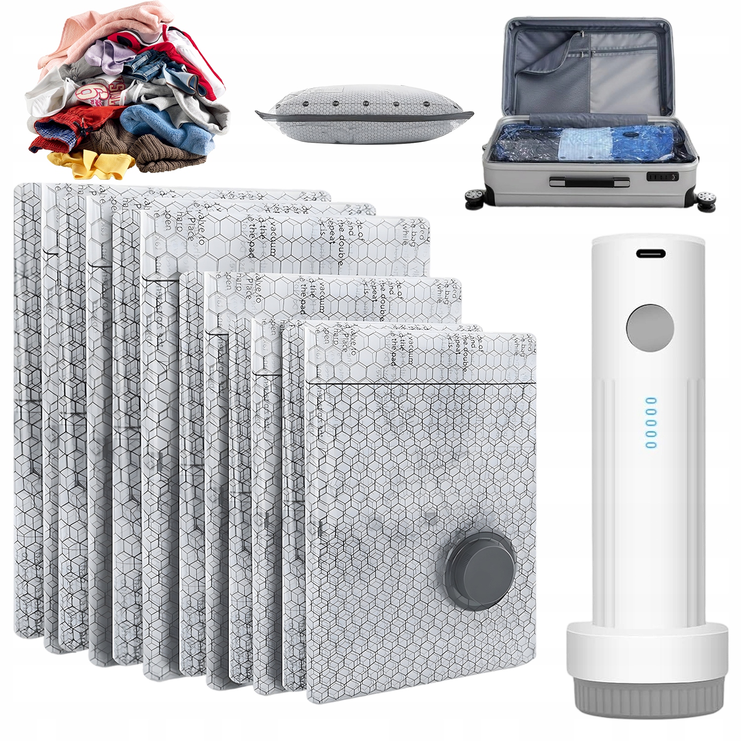 👗Оснащені вакуумним насосом, пакети вакуумуються лише за 30 секунд одним натисканням кнопки. Після стиснення їхній розмір значно зменшується, що дозволяє легко зберігати більше речей.