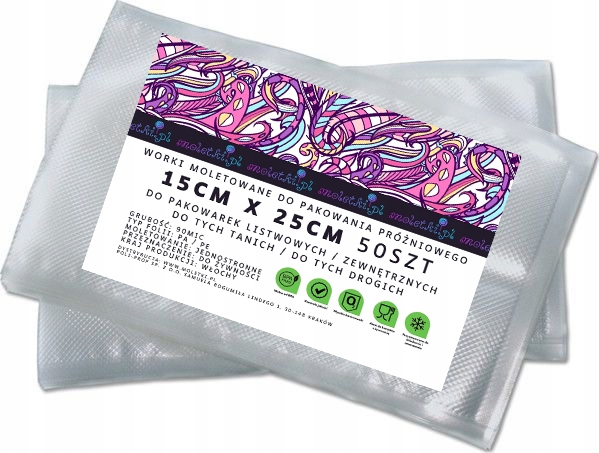 Вакуумні пакувальні пакети – продукт, який все частіше використовується в приватних будинках для приготування та зберігання їжі. Шукаєте ідеальні вакуумні пакети для свого запаювача? В асортименті інтернет-магазину Moletki ви знайдете вакуумні пакети, які ідеально підходять для пакування (і заморожування) різноманітних продуктів - м'яса, нарізки, риби, сиру, готових страв, фруктів і овочів.