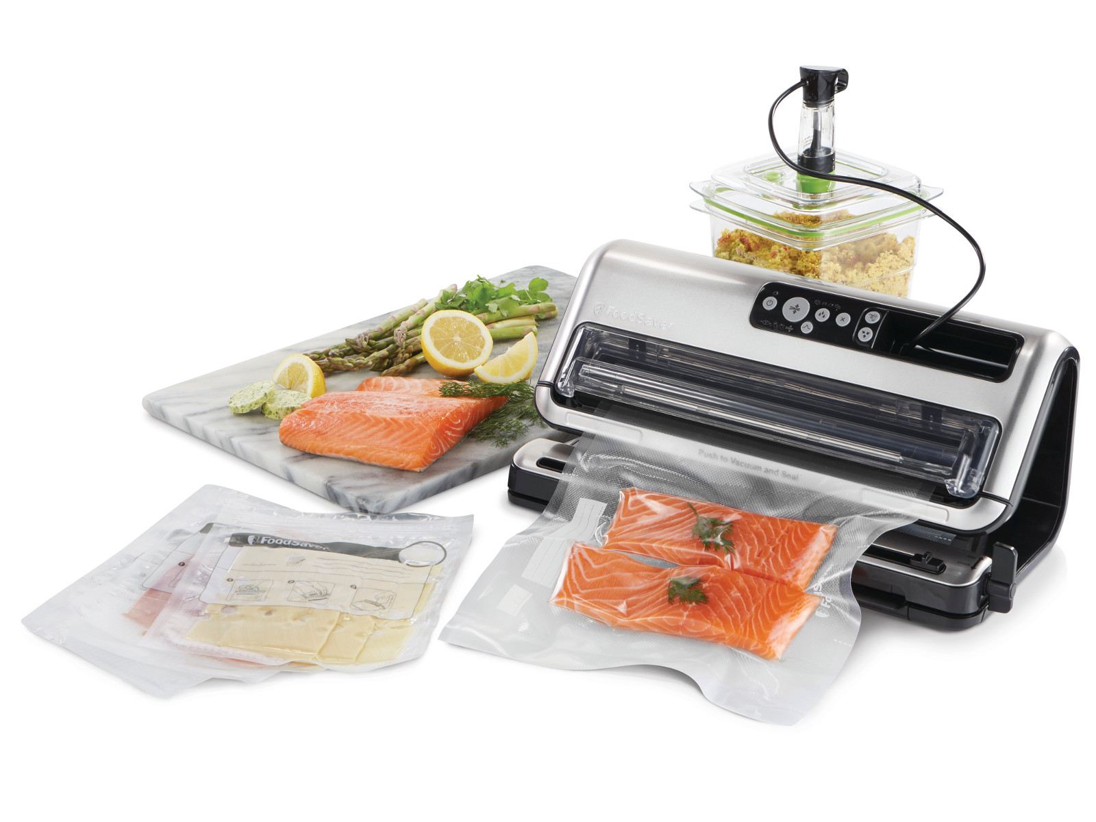 Завдяки роздільним режимам запечатування сухих і вологих продуктів, система вакуумного пакування може працювати з будь-якими типами продуктів. Його автоматичне розпізнавання рідини робить роботу з запечатувачем ще простішою, він автоматично перемикає режими, визначаючи тип їжі. Запаювач також має налаштування пульсу (для делікатних продуктів), контейнерів і навіть для маринування їжі. Зручний режим «запечатування» дозволяє закривати вміст без видалення повітря для швидкого та легкого короткочасного зберігання. Більше того, запаювач має вбудований ручний пристрій для запечатування, призначений для використання з нашим асортиментом пакетів FoodSaver Fresh Ziplock Bags і Fresh Containers. Правильне запечатування означає краще збереження, менше харчових відходів і більше грошей на щотижневих продуктах.