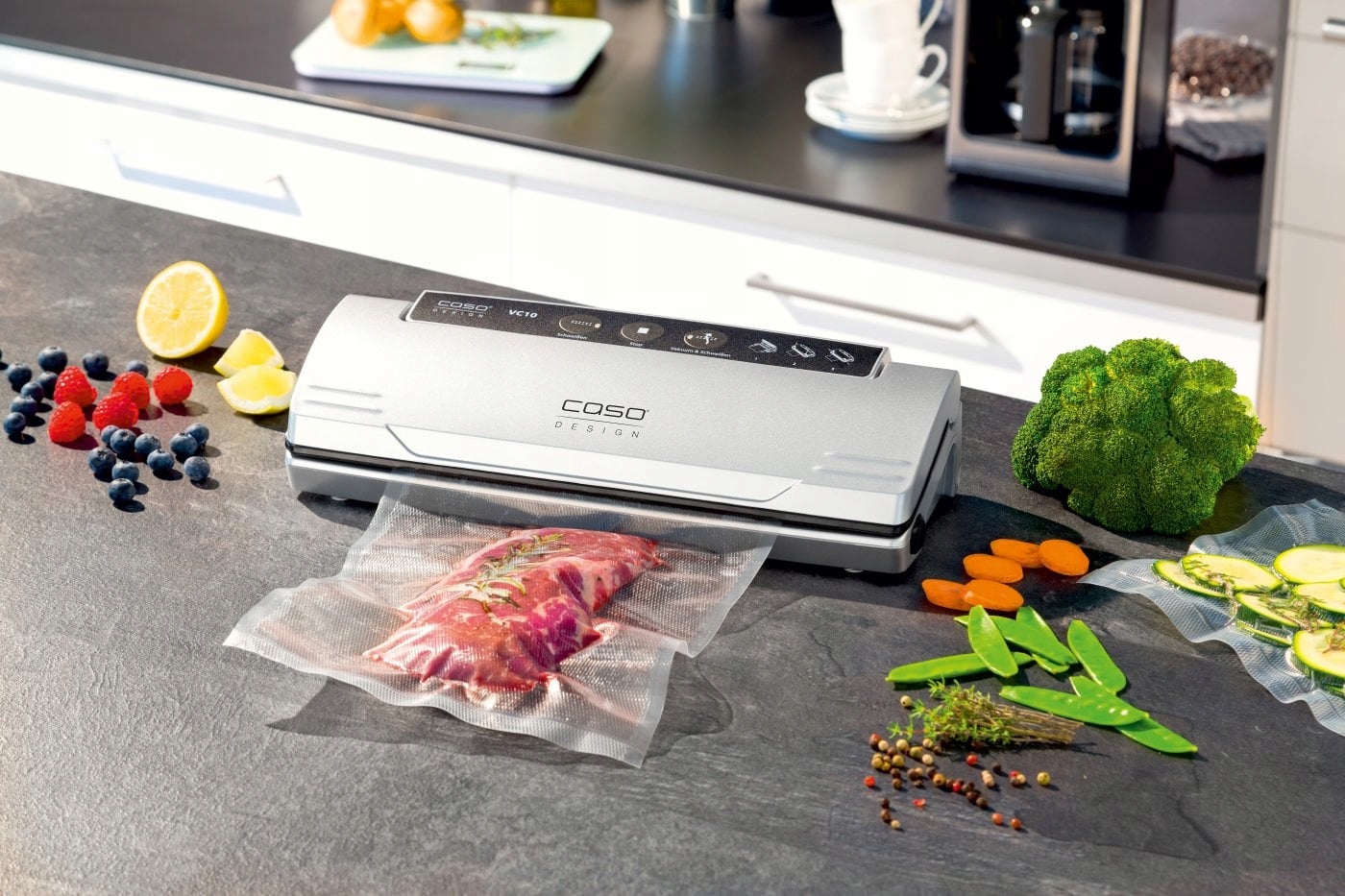 Ваша їжа залишатиметься свіжою набагато довше завдяки вакуумній упаковці CASO DESIGN VC10. Пристрій забезпечує вакуумну упаковку з ефективністю приблизно 90% при -0,8 бар, завдяки чому їжа не псується і залишається свіжою без використання додаткових консервантів. У набір входить 10 пакетів CASO DESIGN, преміальна якість гарантує стійкість пакетів до розриву або розтріскування. Вони ідеально підходять для приготування су-від.