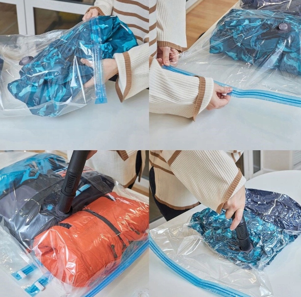 З наповненого мішка речами ми відсмоктуємо повітря за допомогою пилососа або всмоктувальної помпи, завдяки чому зменшуємо об’єм сумки та збільшення простору.
