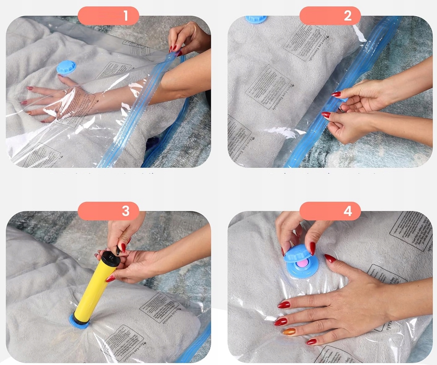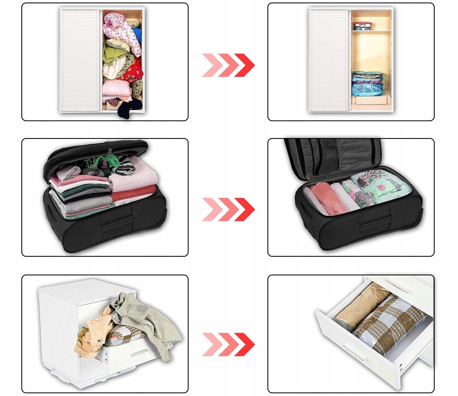Це ідеальне рішення для людей, які хочуть заощаджувати простір і підтримувати порядок шафи, валізи та ящики. Легкий, компактний і надзвичайно ефективний - незамінний під час подорожі, переїзду або сезонного прибирання. Завдяки цьому ви можете легко зменшити об’єм речей, що зберігаються, і ефективно захистити їх від вологи, пилу та комах.