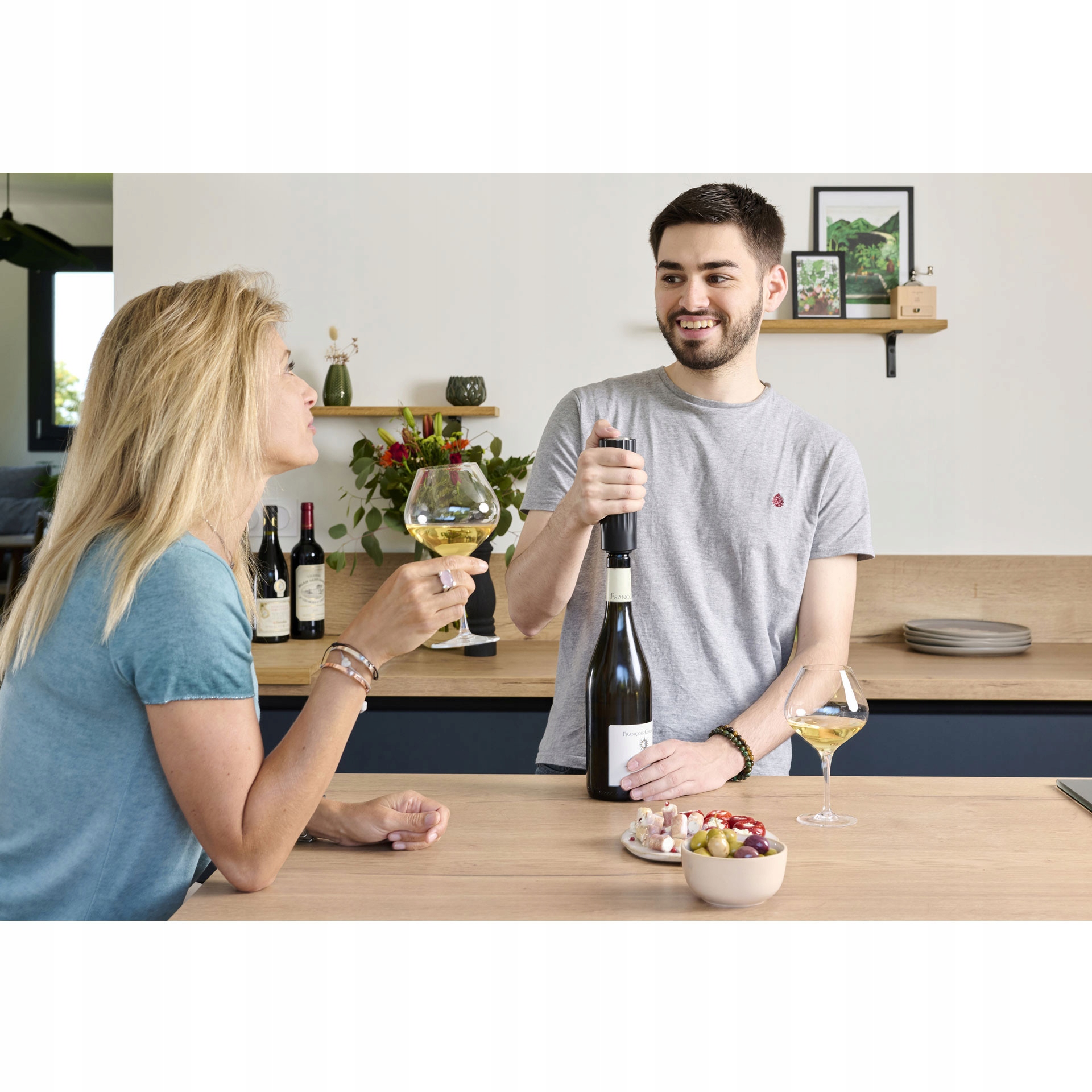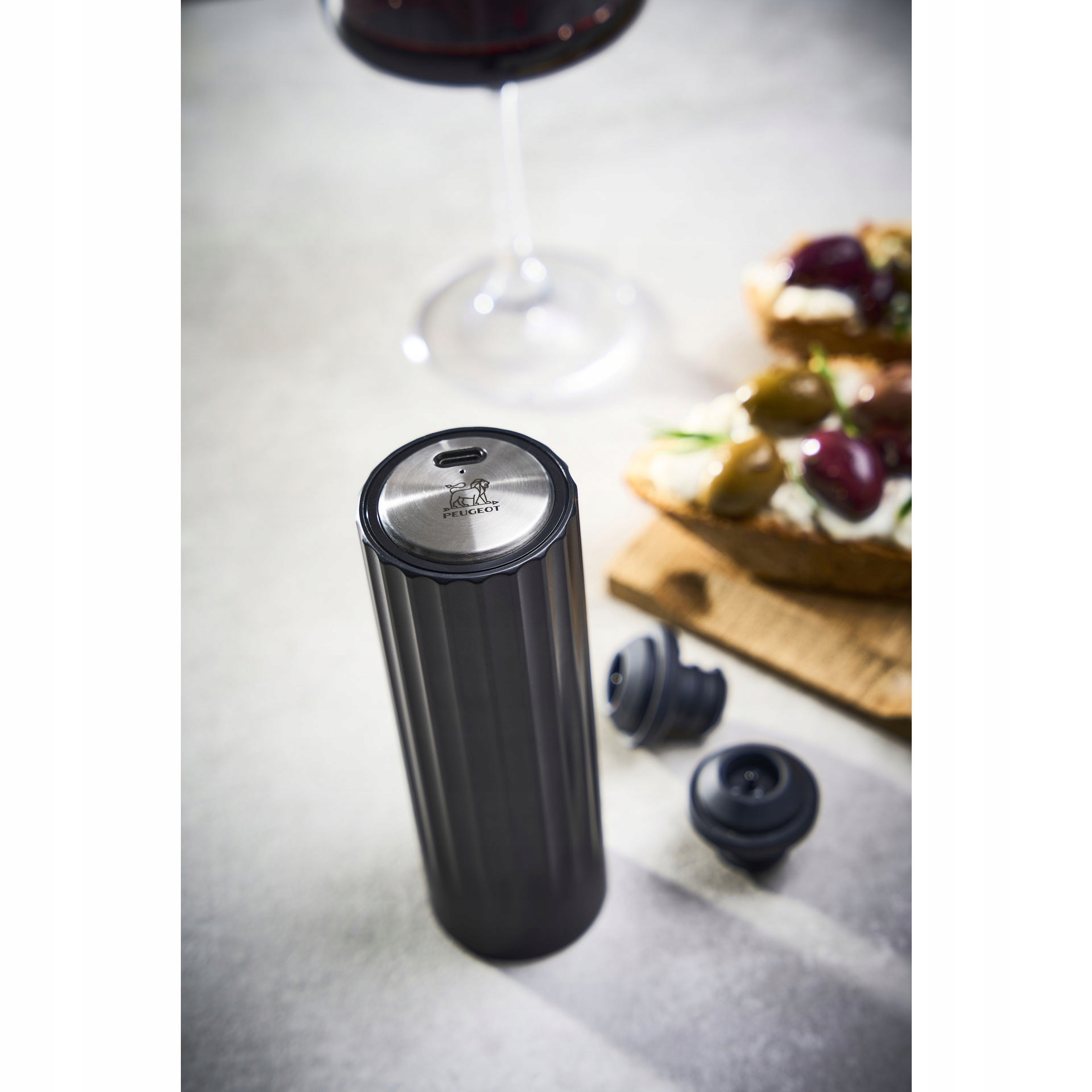 Електричний вакуумний насос Peugeot Preserve, оснащений розширеними функціями, які дозволяють створювати ідеальний вакуум у пляшці, що уповільнює процес окислення та довше зберігає якості вина (до 5 днів). Це незамінний аксесуар для кожного любителя вина, який хоче довше зберегти якість відкритої пляшки вина. Насос виготовлений з міцного матеріалу ABS з елегантним чорним покриттям, що дозволяє ефективно підтримувати свіжість і аромат ваших улюблених вин. Ергономічна форма забезпечує легкість і комфорт використання з мінімальними зусиллями. У набір входять дві суцільні вакуумні пробки, що забезпечують повну герметичність і захист від втрати аромату.