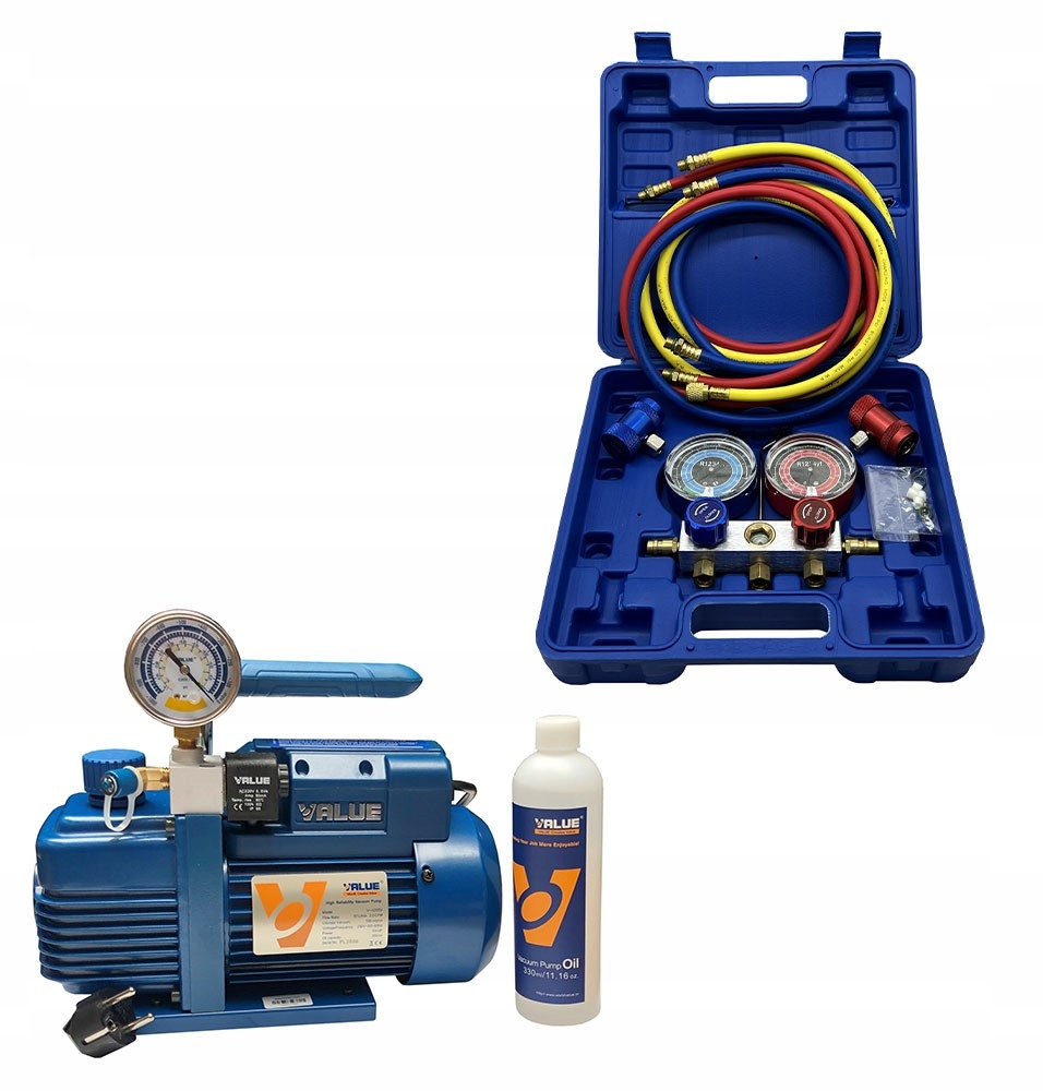 Вакуумний насос системи кондиціонування повітря VALUE V-i120SV і автомобільної системи кондиціонування повітря з електромагнітним клапаном і вакуумметром.