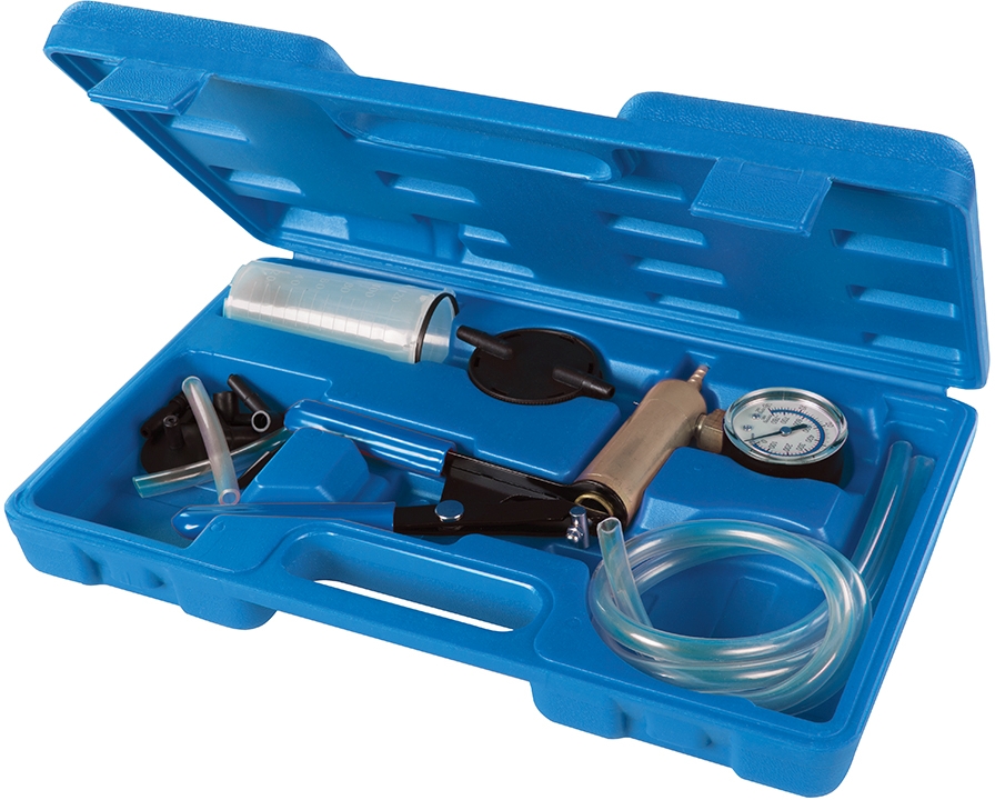 - В комплект входить вакуумний насос з тиском манометр, бак і кришки, адаптери, шланги та міцний футляр.