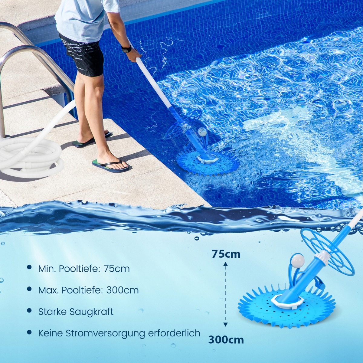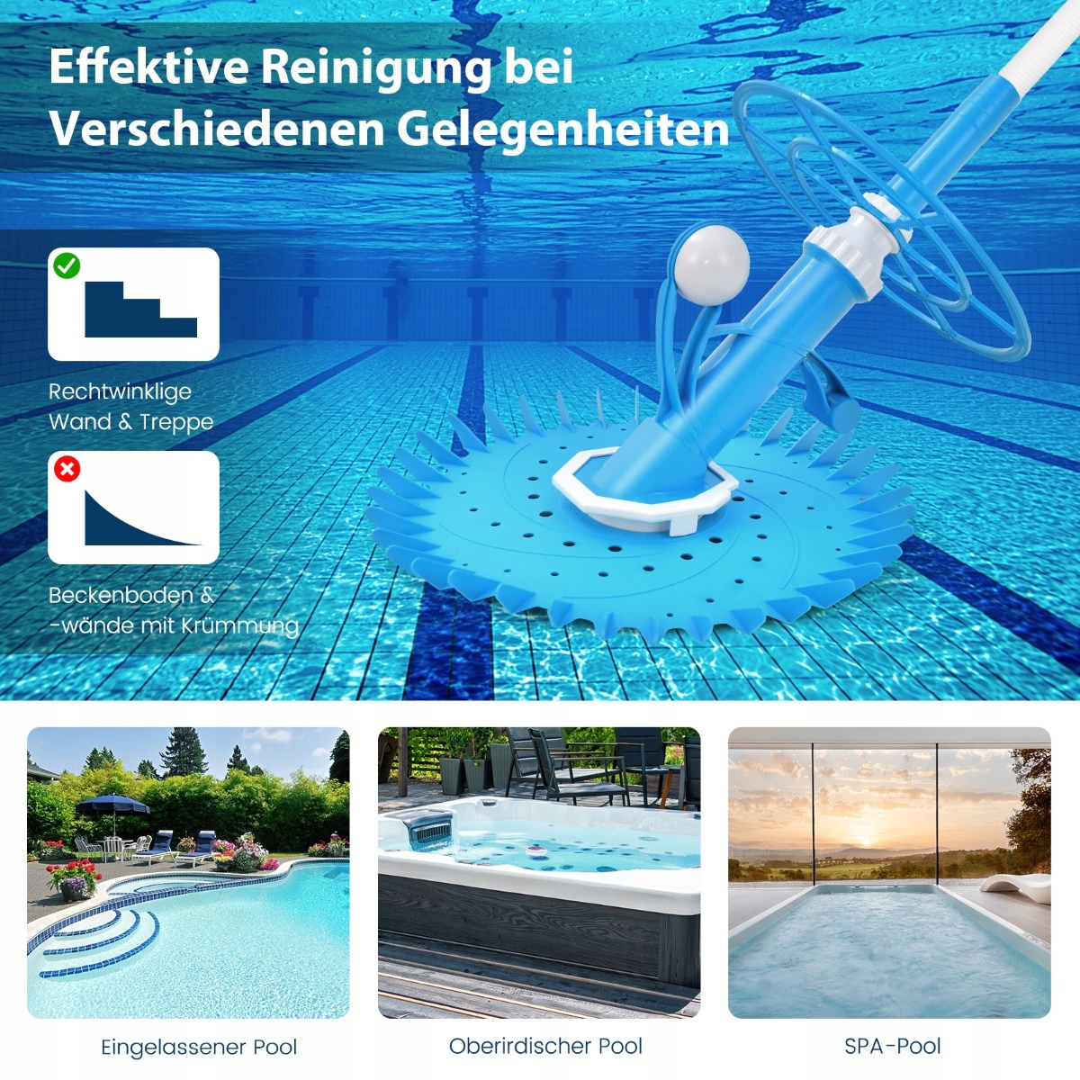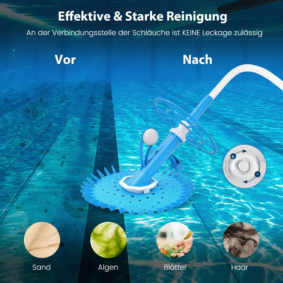 Пакет із усіма включеними: Окрім вакуумного очищувача басейну, пакет також містить змінну вакуумну мембрану, 2 роз'єми коліна, хустку для очей, вакуумна пробка, клапан регулювання та 10 водних шлангів з довжиною 1 м, що збільшує комфорт, що сприяє адаптації різних умов у басейні.