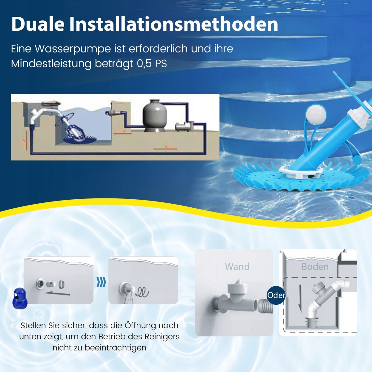 4Встановлення без використання інструментів: Не потрібні інструменти для автоматичного очищувача вакууму в пулі. Посібник чітко показує, як зібрати основний корпус і прикріпити його до насоса для басейну (принаймні 1/2 к.с.). Ви можете відрегулювати довжину садового шланга, швидкості потоку води та переміщення.
