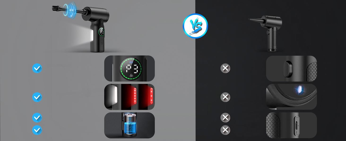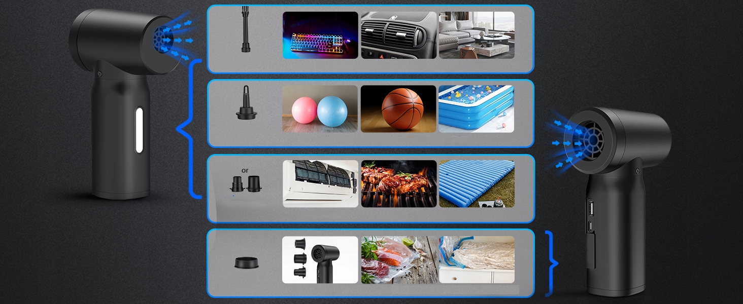 Разивний повні аксесуари та функції 2 в 1 : не тільки електрична пилова тканина, але й пилосос. Передній кінець дме пил, а задній кінець смокче пил. Різні типи форсунок та пензлів не тільки для очищення клавіатур, лінз камер, підвіконня вікон, але і для надувних предметів, таких як повітряні матраци, подушки безпеки, плавальні диски тощо