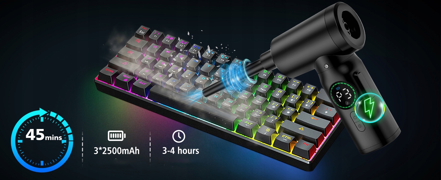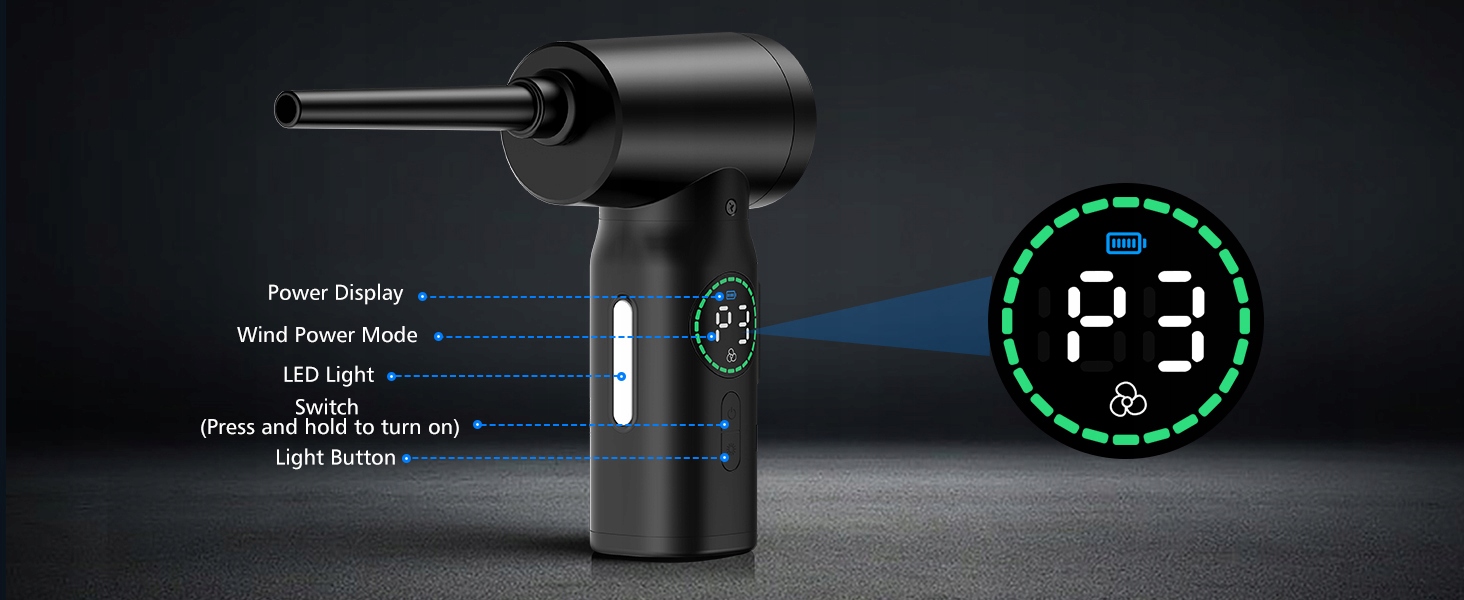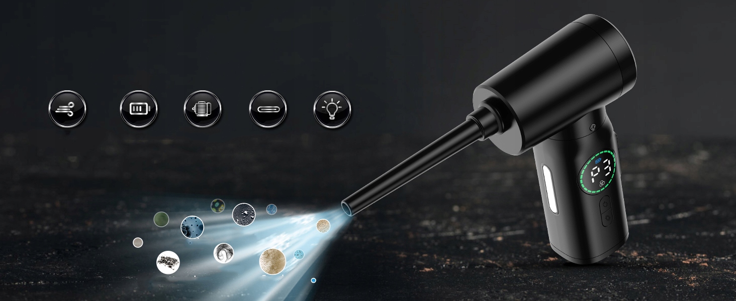 широкий в одному пристрої, простий у перенесенні: виріб важить лише 360 г, оснащений 4 кінчиками всмоктування, 4 пензлями та сумкою для зберігання. Підходить для пилососних комп’ютерів, клавіатур, автомобілів, вентиляторів, бузкових вікон тощо. Багатофункціональна наконечник використовується для перекачування плавальних коліс, кульок для йоги, подушок безпеки тощо, але також показує споживання акумулятора, завдяки якому на першому погляді стануерний стан роботи чіткий; Світлодіодне світло дозволяє легко очистити темні куточки та забезпечує чудову зручність для чищення. Побудований світлодіодний світло має 3 режими, які дозволяють легко очистити темні кути та використовувати для з'єднань тривоги.