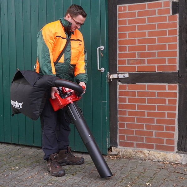 у вакуумному режимі листя всмоктуються великою насадкою до сталевих мульчуючих лопатей, розташованих перед турбіною, що значно зменшує об'єм смоктаного матеріалу. Сумка оснащена плечовим ремінцем, який передає всю вагу посіяних листя, завдяки якому руки не піддаються стресу на роботі. Підключення сумки та пилососного очищувача вирішує коліно, що дозволяє пилососному очищенню відносно вільного руху.
