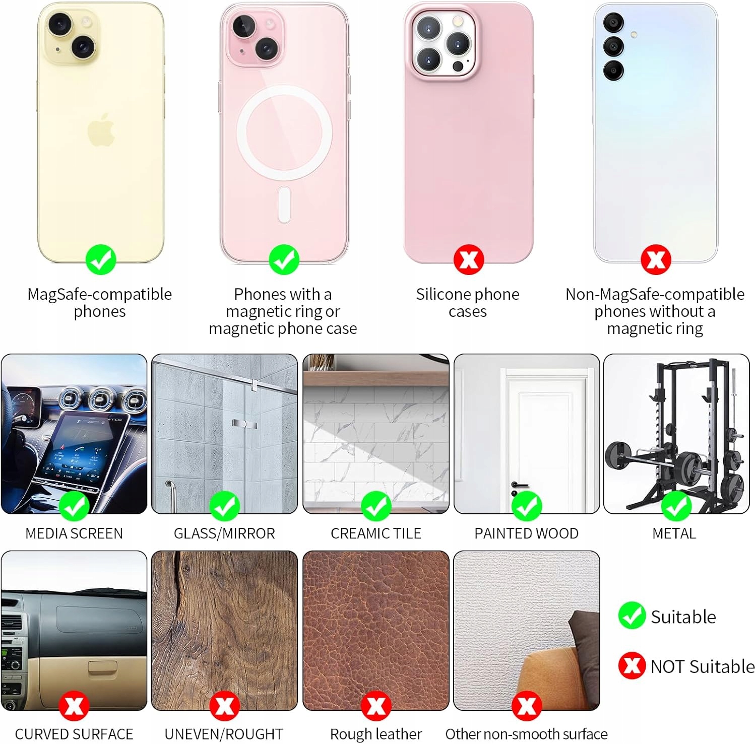 [Багатофункціональне використання】 Цей магнітний власник мобільного телефону з присосною чашкою є універсально сумісним і може безпечно прикріпити телефон до будь -якої гладкої поверхні, наприклад, дзеркала, плитка, стіни, скло, столики літака, машини, кухні або спортзали та обладнання. Незалежно від того, де ви знаходитесь, ви можете легко переглянути або записувати фільми. 【Відмінне смоктання】 Магнітне та пилососне поверхня пристрою забезпечує відмінне зчеплення, що робить його чудовим вибором для мобільних телефонів. Сумісність] ✅ сумісна з iPhone 15, 15 Plus, 15 Pro, 15 Pro Max, 14, 14 Pro, 14 Max, 14 Pro Max, 13 Mini, iPhone 13 Pro, iPhone 13 Pro Max, iPhone 12 Mini, iPhone 12 Mini, 12 Pro, 12 Pro Max. Pro, 12 Pro Max. ⚠ Якщо ваш телефон не сумісний з Magsafe, вам доведеться використовувати магнітне кільце або магнітний телефон.