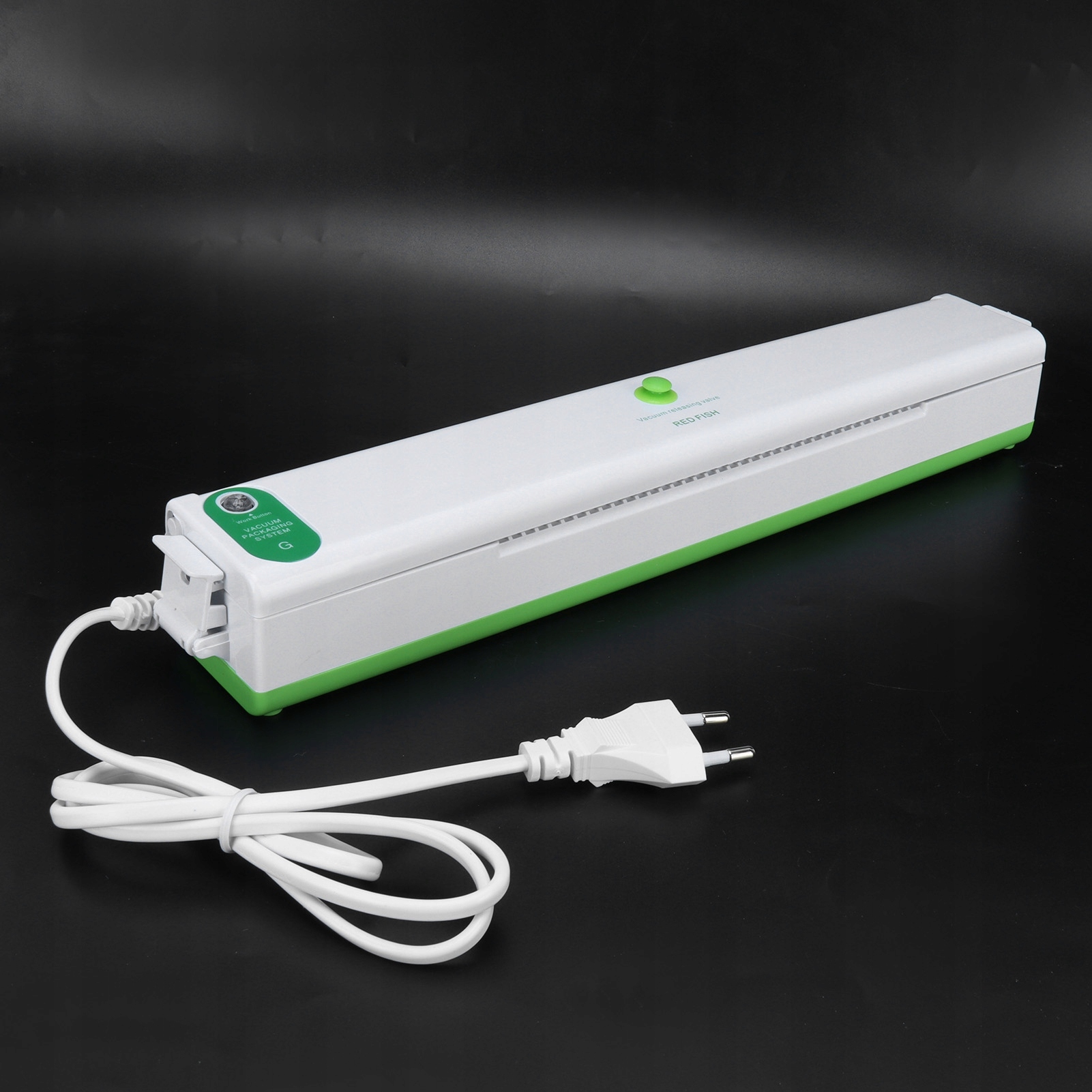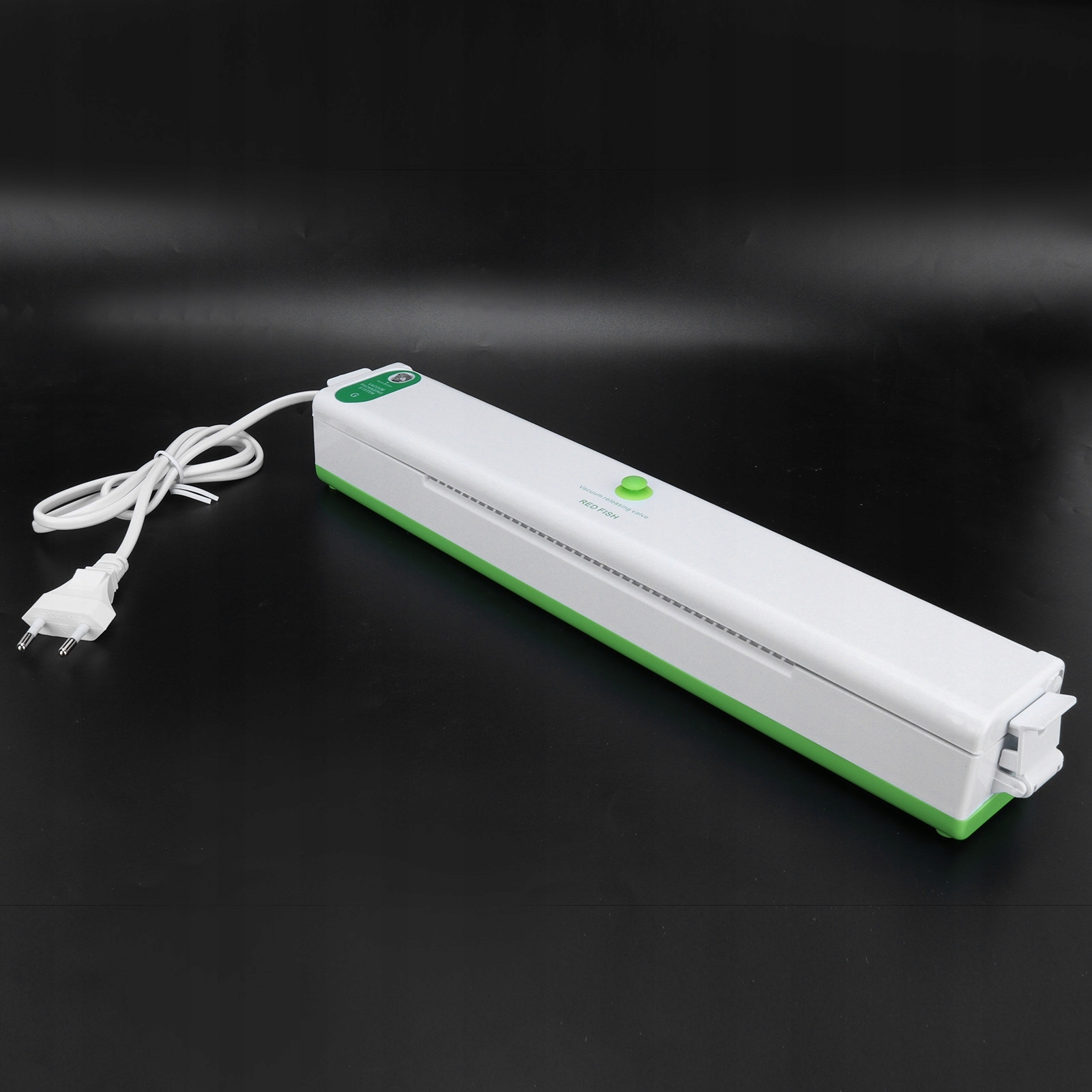 2. Відклавши кришку, зафіксуйте гачки зліва і справа. Потім натисніть зелену автоматичну кнопку, вакуумний насос починає працювати (зелене світло блимає), і повітря з поліетиленового пакета починає витягуватися.