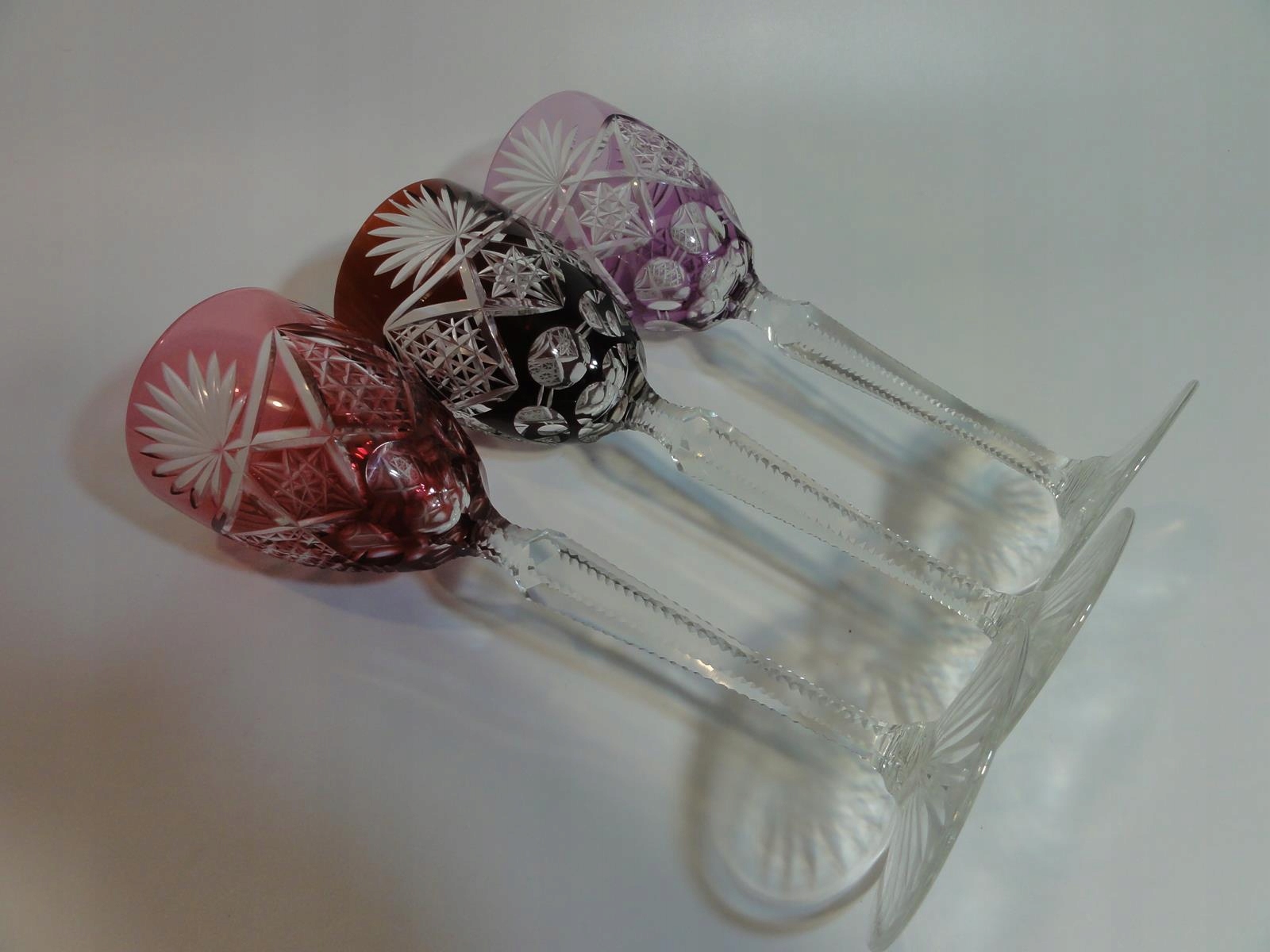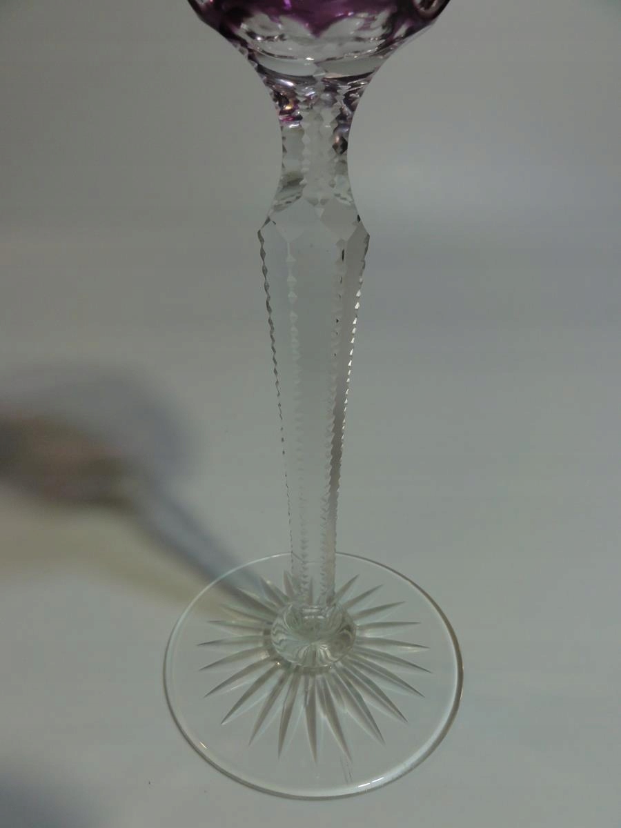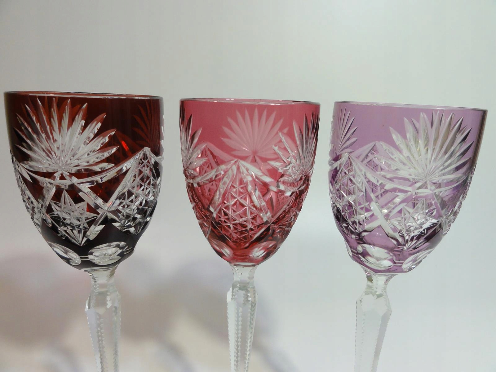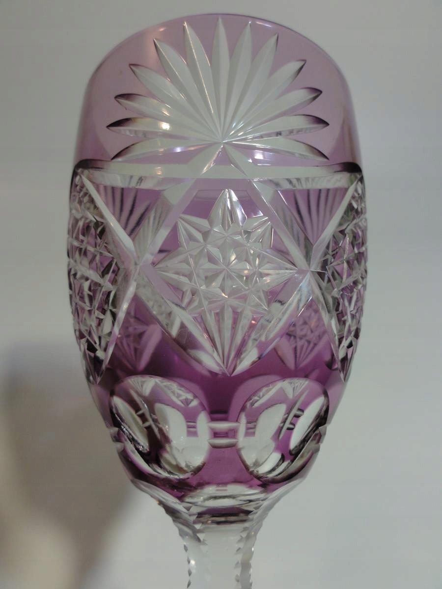 *кулихи виготовлені зі свинцевого скла, видувного у форму, шліфованого та полірованого, покриття рубіновим, фіолетовим та темно-рожевим, стовпчастий стрижень, по краях виїмчастий, ніжка з розеткою внизу,