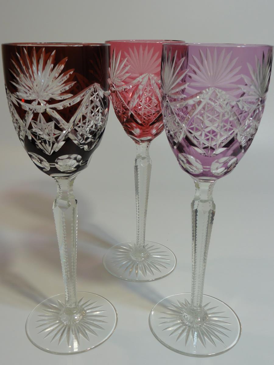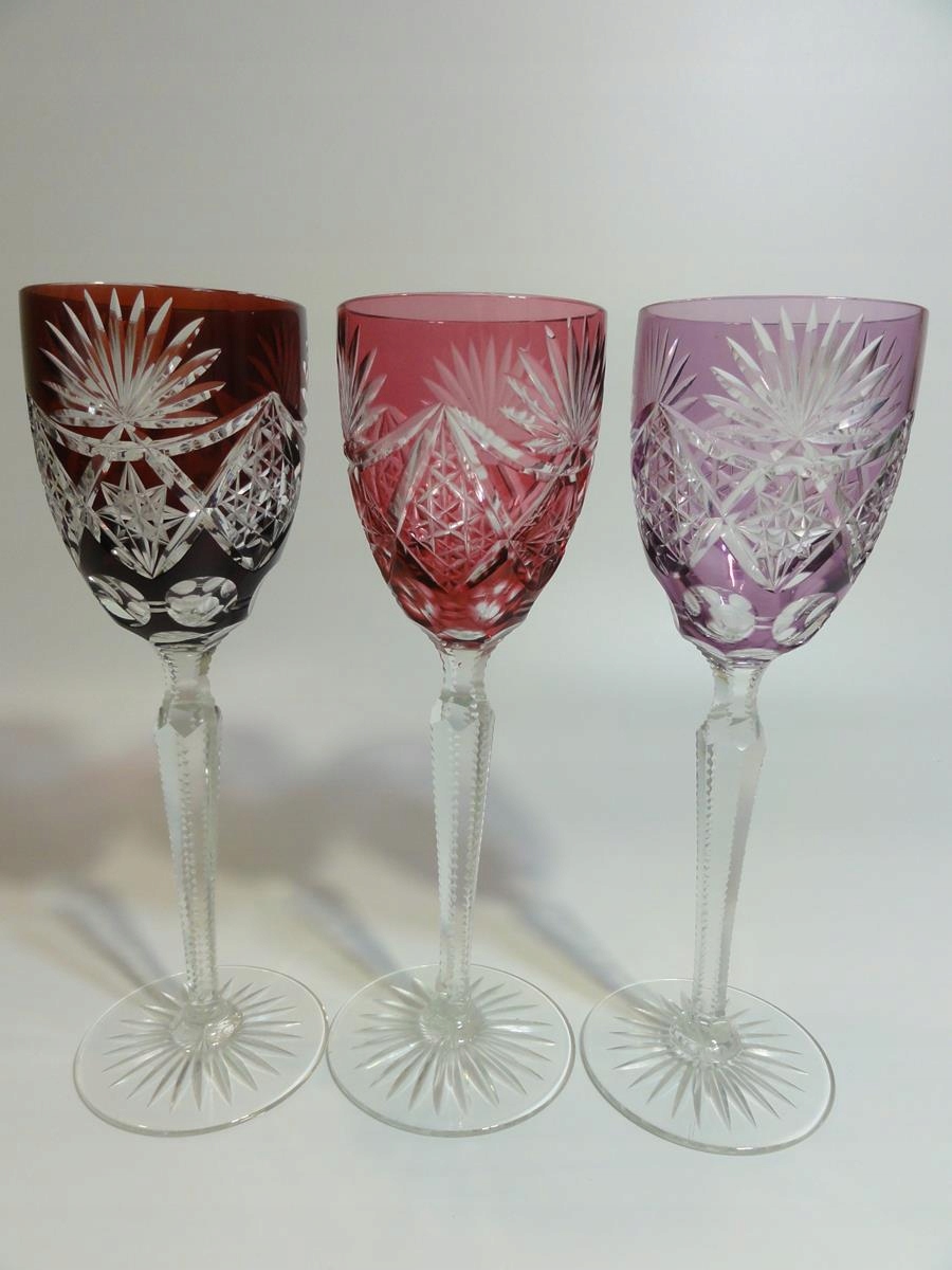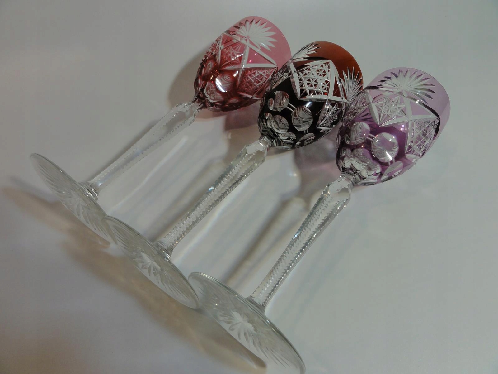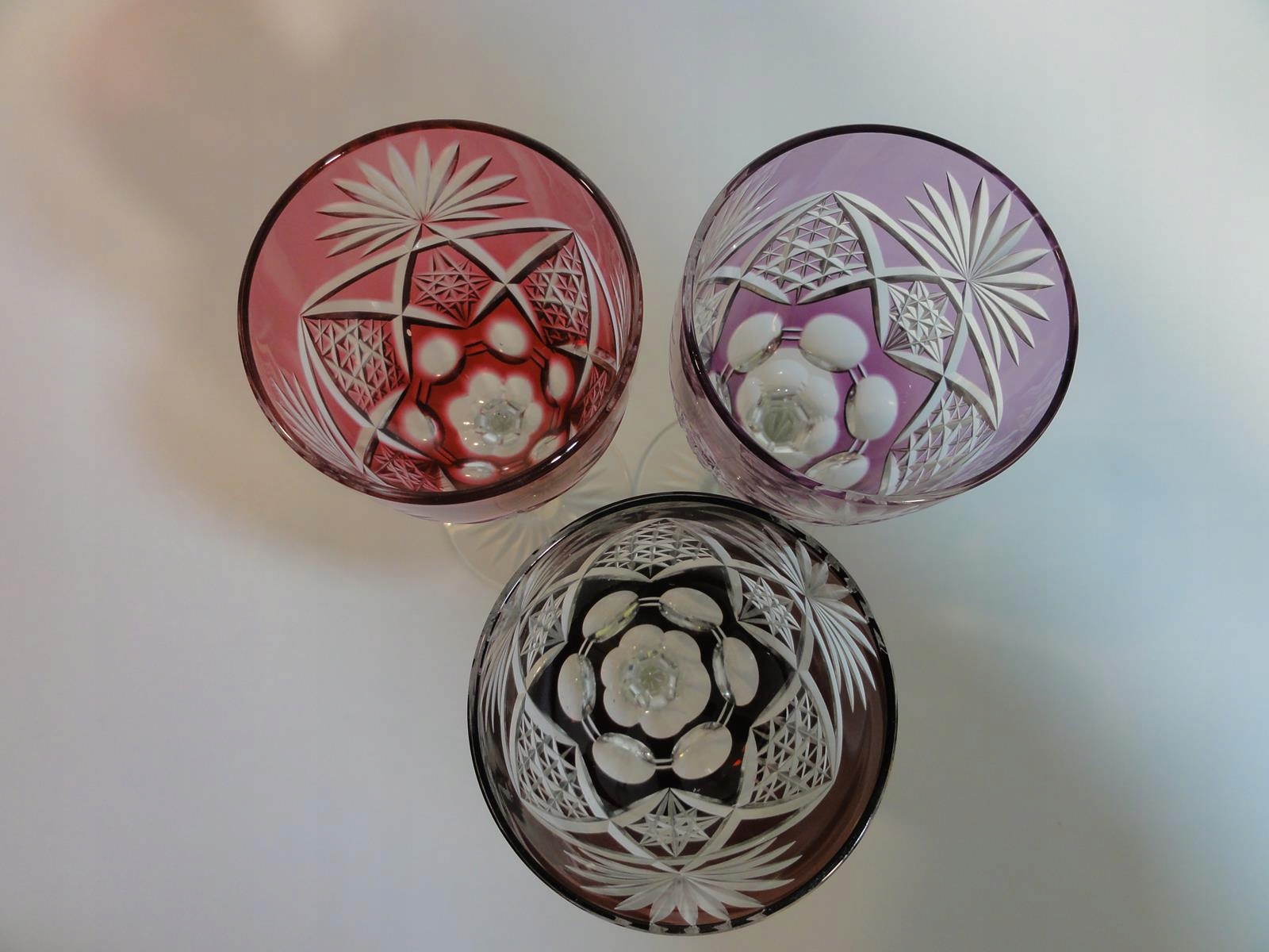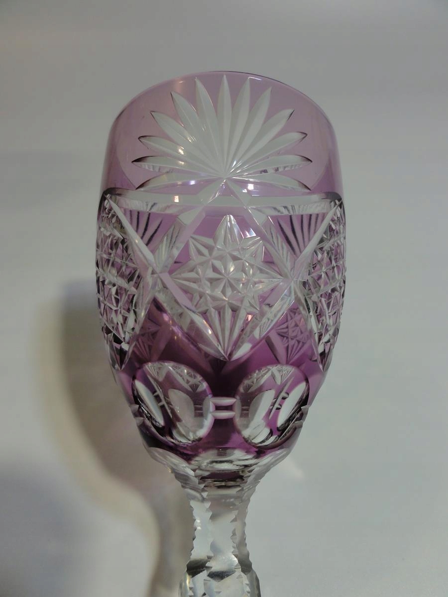 *кулихи виготовлені зі свинцевого скла, видувного у форму, шліфованого та полірованого, покриття рубіновим, фіолетовим та темно-рожевим, стовпчастий стрижень, по краях виїмчастий, ніжка з розеткою внизу,