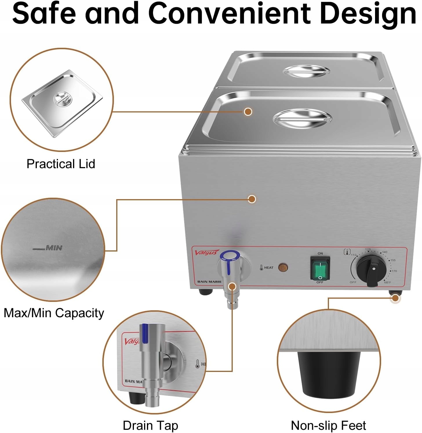 Кришки гарантують, що смак їжі залишається збереженим, і вам не потрібно хвилюватися, що їжа стане назовні і буде зламана. Стандартна база Bain Marie може бути оснащена глибиною 15,24 см, які можна замінити під час використання, щоб відповідати кожному випадку.
