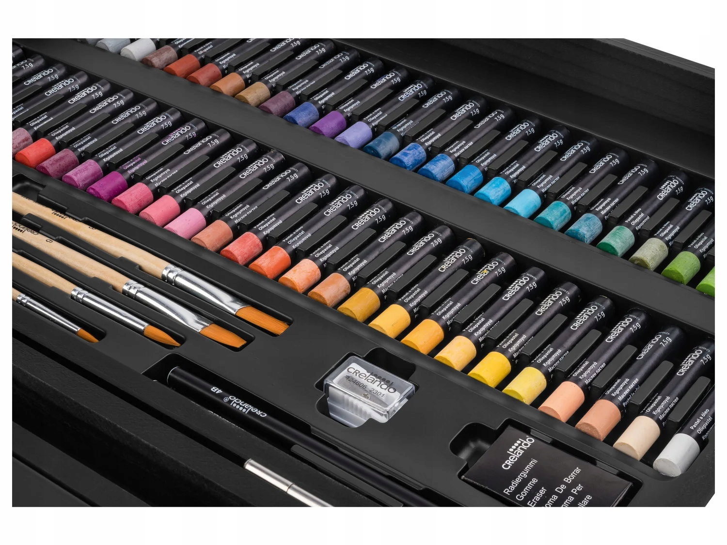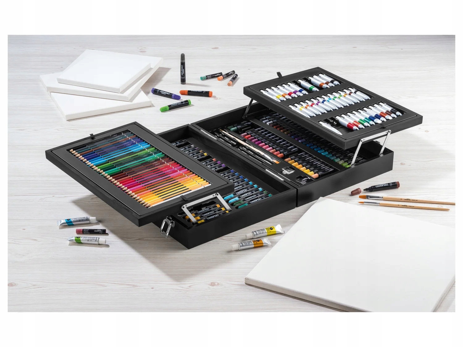 Якщо ваша дитина любить малювати, малювати та творити, цей величезний набір для малювання Crelando® стане хітом. Міцна дерев'яна валіза преміум-класу містить аж 174 елементи, які дозволяють втілювати ідеї на всіх рівнях - від перших ескізів до просунутих живописних робіт.