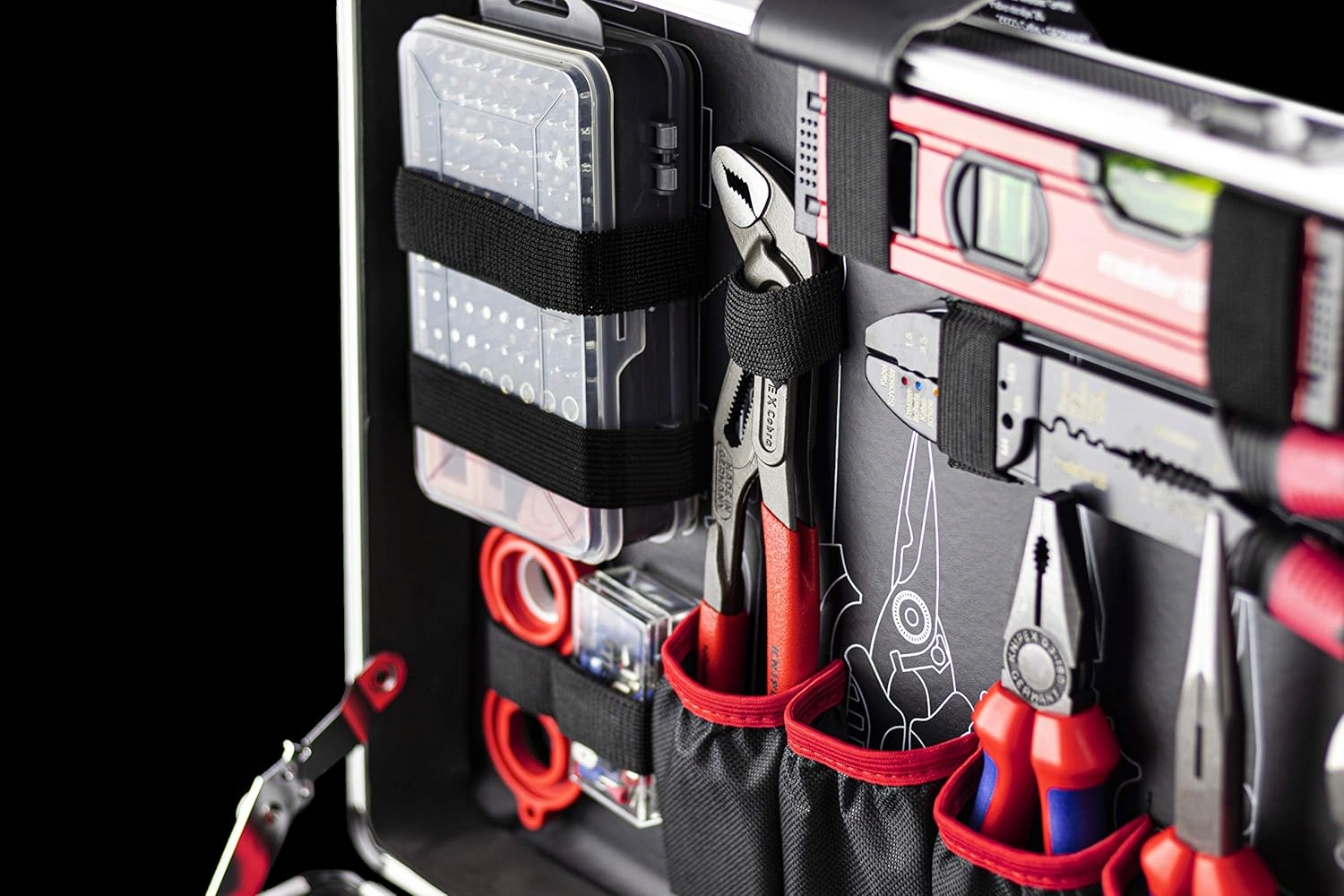 1 x області насоса Knipex 250 мм · 1 x плоскі щіпки knipex · 1 x Knipex knipex · 1 x плоскогубці з боку knipex · 1 x затискачі плоскогубці · 1 x набір 40-частинних наконечників кабелю.