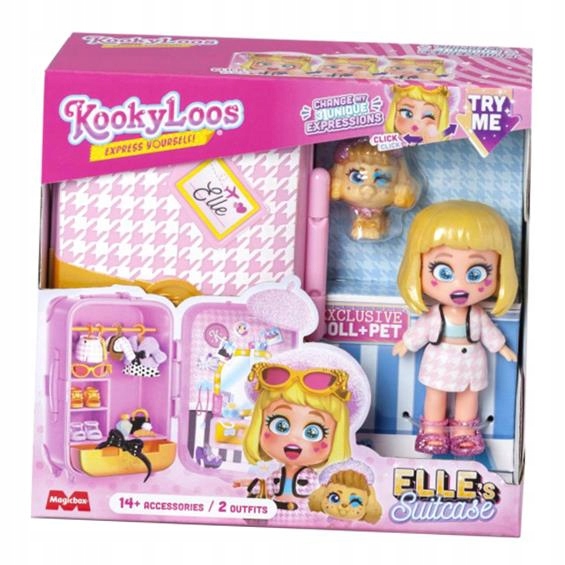 Готові до подорожі? Валізи KookyLoos містять усе, що вам потрібно, щоб весело провести час, де б ви не були. Можна зібрати 4 моделі! Ель — наймодніша: її вбрання від кутюр — остання мода в Парижі. Готові відвідати ювелірні магазини на Вандомській площі та вулиці Шамбон? Ви вирішуєте, яка з двох моделей візьме участь у фінальному параді! Пам’ятайте, що ви можете змінити його три вирази одним клацанням миші та зберігати все у валізі, щоб взяти його куди завгодно! Вміст: 1 ексклюзивний KookyLoos, 1 ексклюзивний вихованець, +13 аксесуарів, вішалки, список експресій