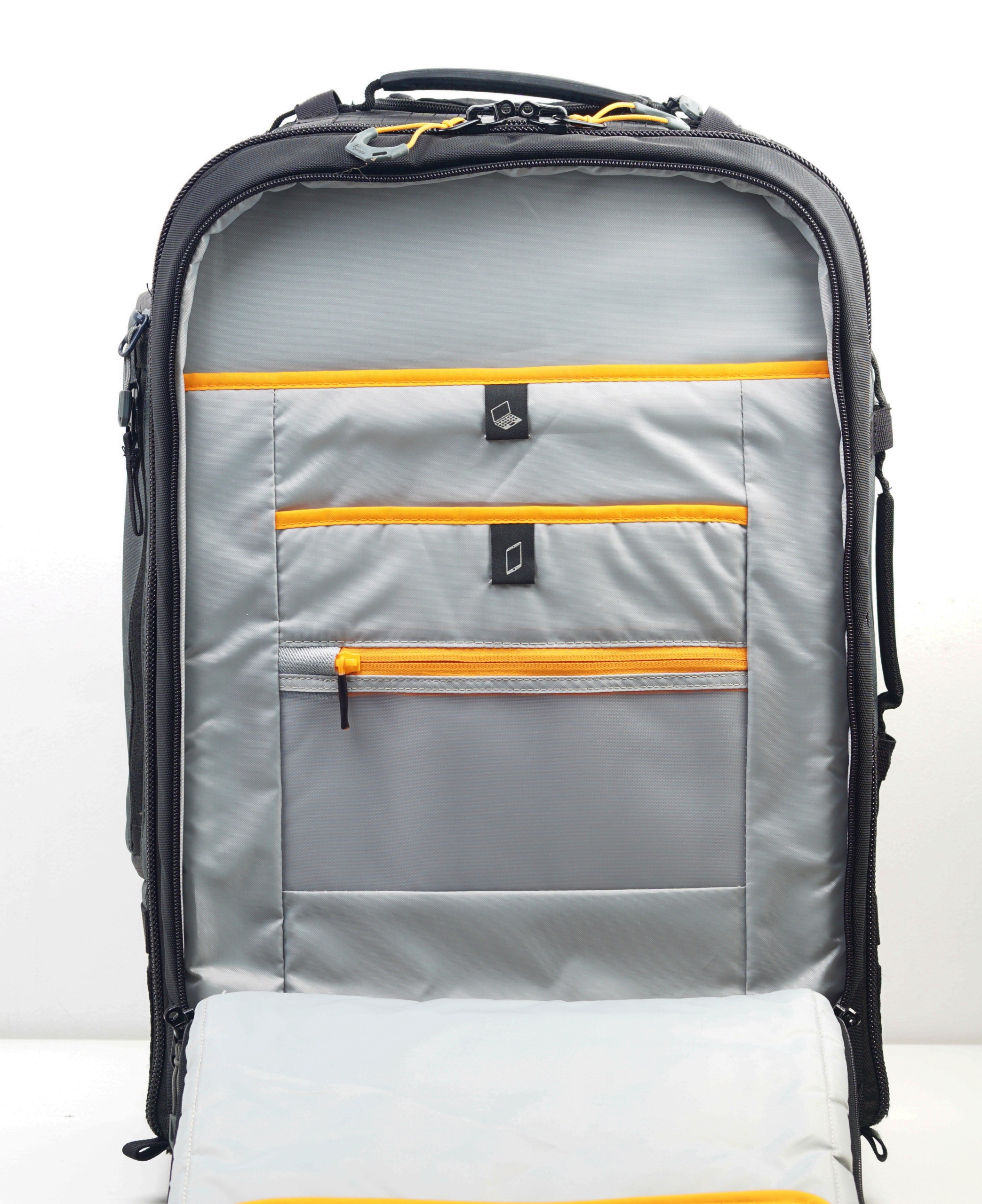 RLX 450 AW IIце чохол із функцією рюкзака, який поміщає дві бездзеркальні або цифрові дзеркальні камери, в тому числі одну з об’єктивом до 200 мм, 5-6 додаткових об’єктивів, 15-дюймовий ноутбук і 10-дюймовий планшет і менші аксесуари.