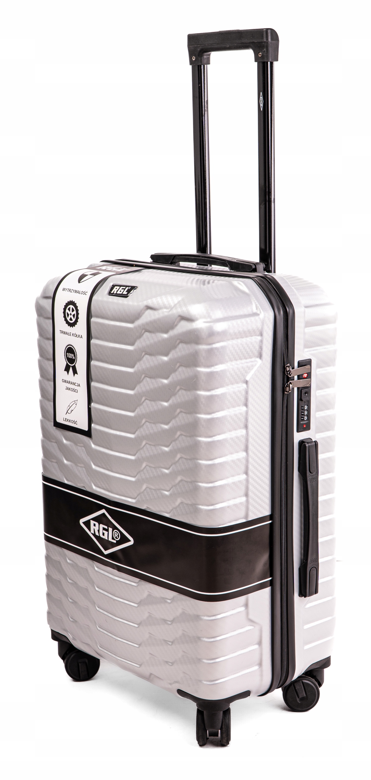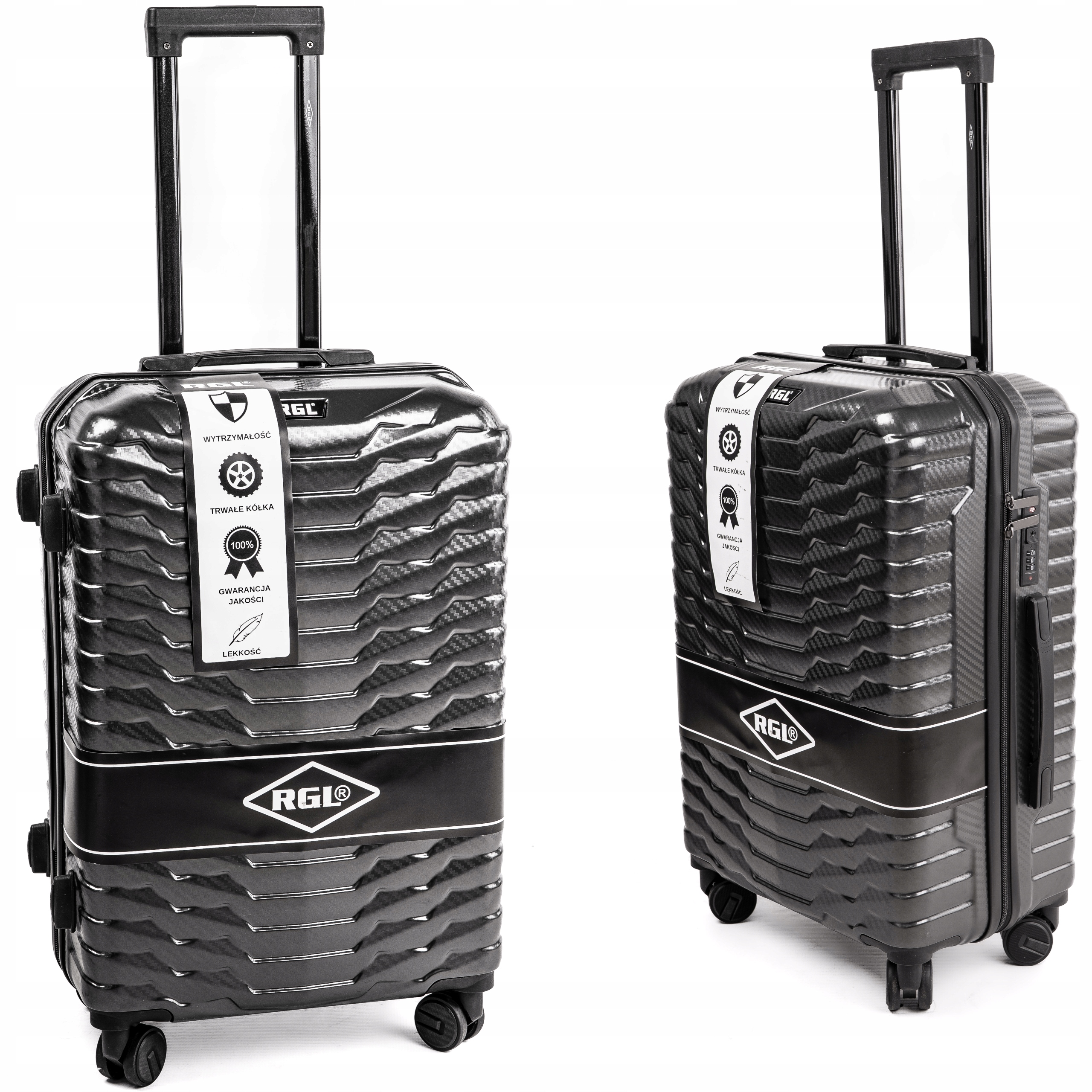- Соцільні валізи з колекції RGL. Виготовлений з полікарбонату. Валізи оснащені чотирма колесами на шарикопідшипниках, висувною ручкою і двома гумовими ручками для зручності перенесення багажу. Крім того, захист у вигляді кодового замка запобігає проникненню всередину сторонніх осіб. Велика і середня валіза має дві ручки для перенесення багажу, маленька - одна вгорі.