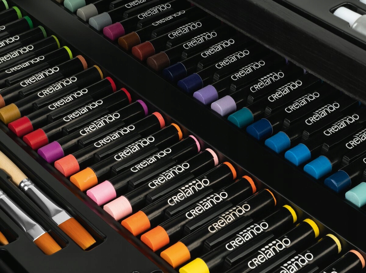 Цей унікальний художній набір для малювання та малювання складається зі 174 елементів, поміщених в естетичний чемоданчик. Завдяки навісним відсікам кожен елемент має своє місце і легко доступний. У набір входять професійні матеріали: акрилові, акварельні та олійні фарби, фломастери, олійна пастель і стійкі кольорові олівці для творчого малювання та малювання на папері чи полотні. У набір також входить багато інших необхідних інструментів: плоска кисть, точилка, два олівці різної твердості та ластик.